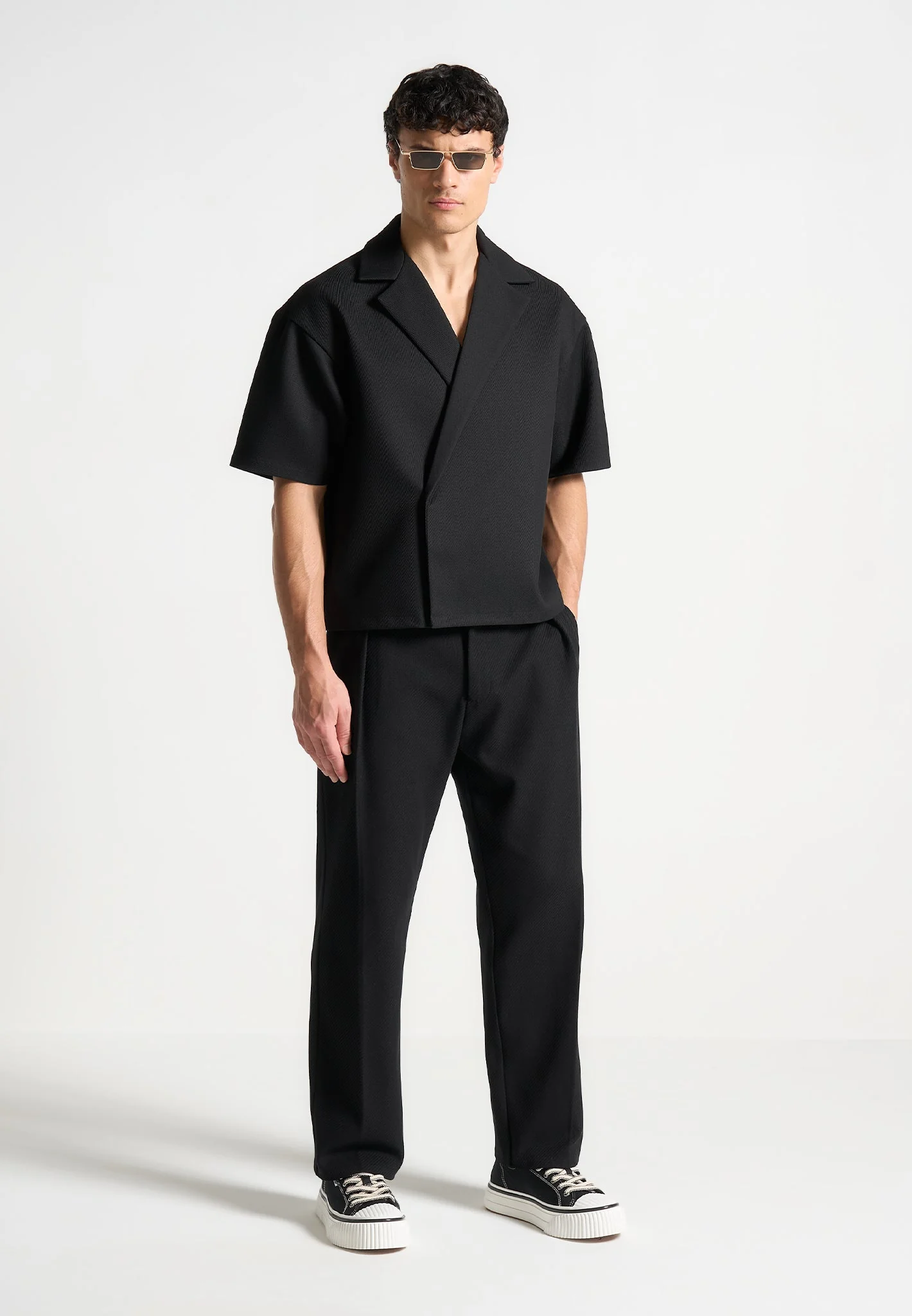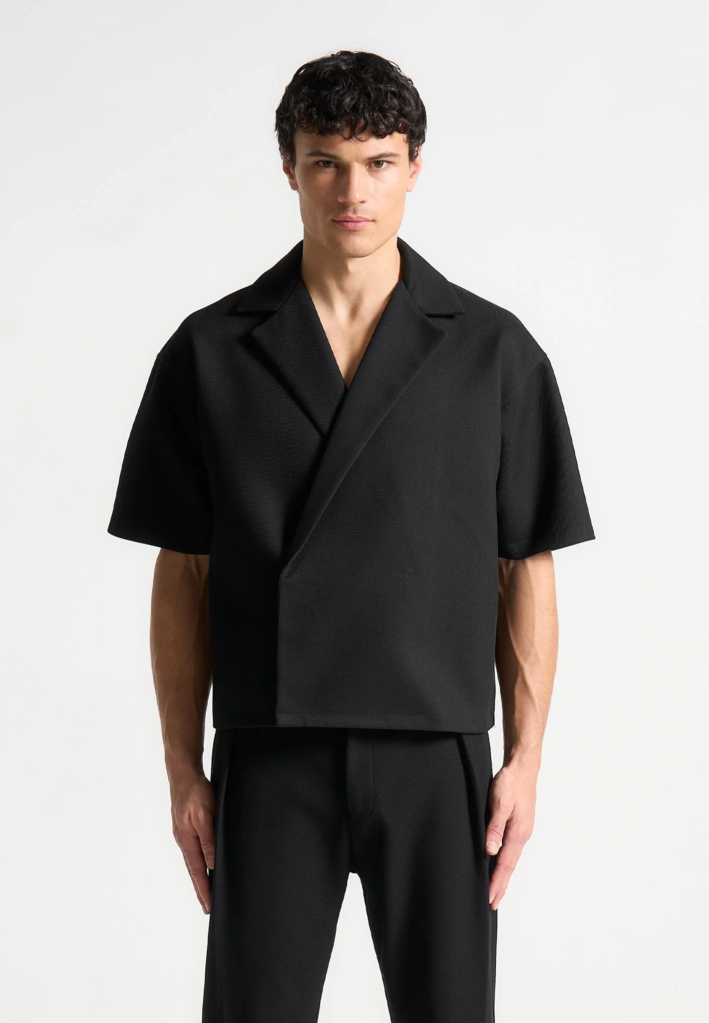 Meticulously designed with an open collar and relaxed fit, our Boxy Twill Double Breasted Shirt in classic Black embodies timeless style. The short sleeve silhouette adds a contemporary touch, ensuring its versatility in any wardrobe. Stay both comfortable and polished throughout the day.