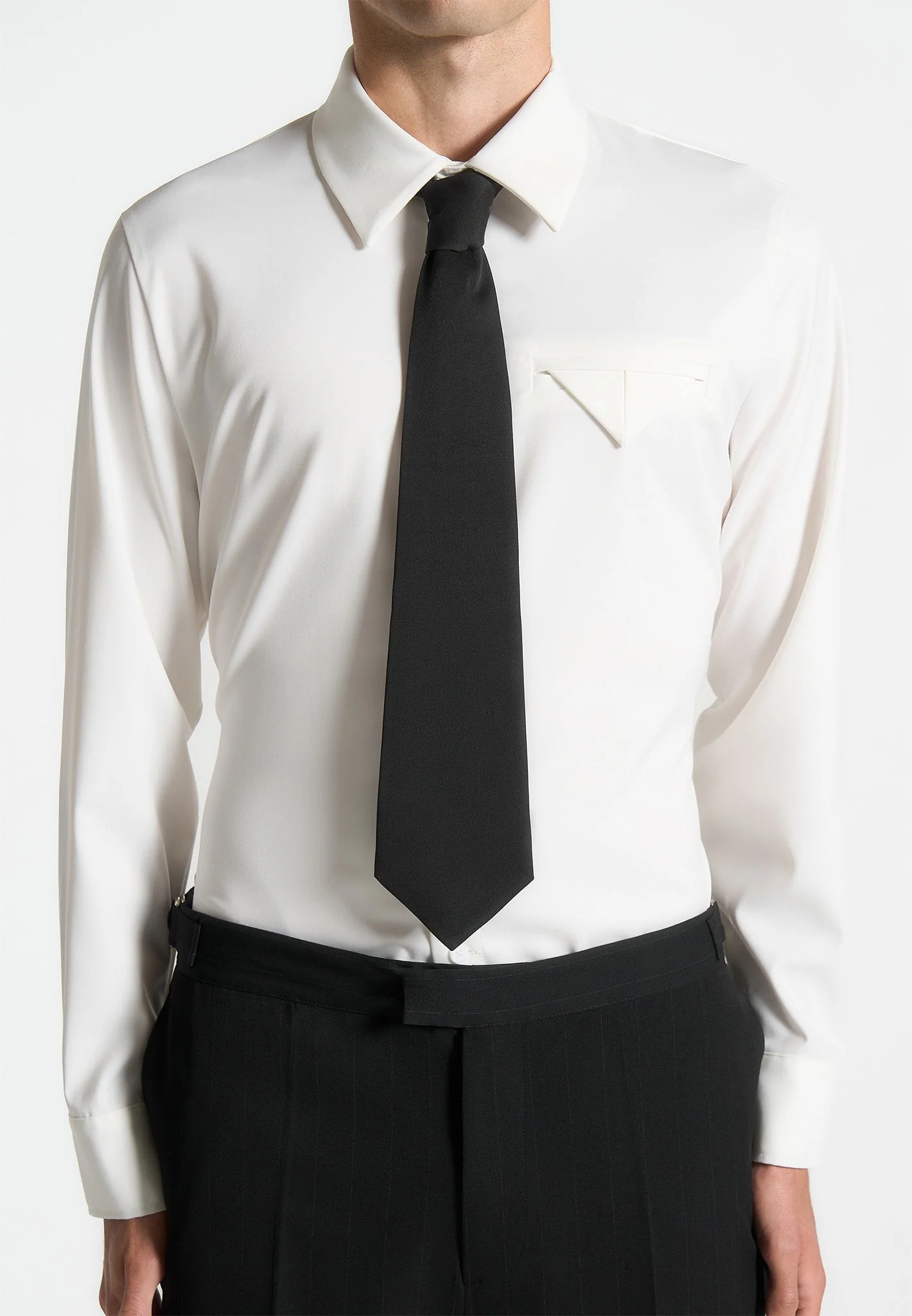 The Éternel Tie in Black is a timeless staple for formal and professional wear, crafted from high-grade silk for a smooth, lustrous finish. Its traditional width and deep brown hue make it versatile for various collar styles and classic knots, while hand-finished edges ensure durability. This tie combines sophistication and resilience, a must-have for any refined wardrobe.