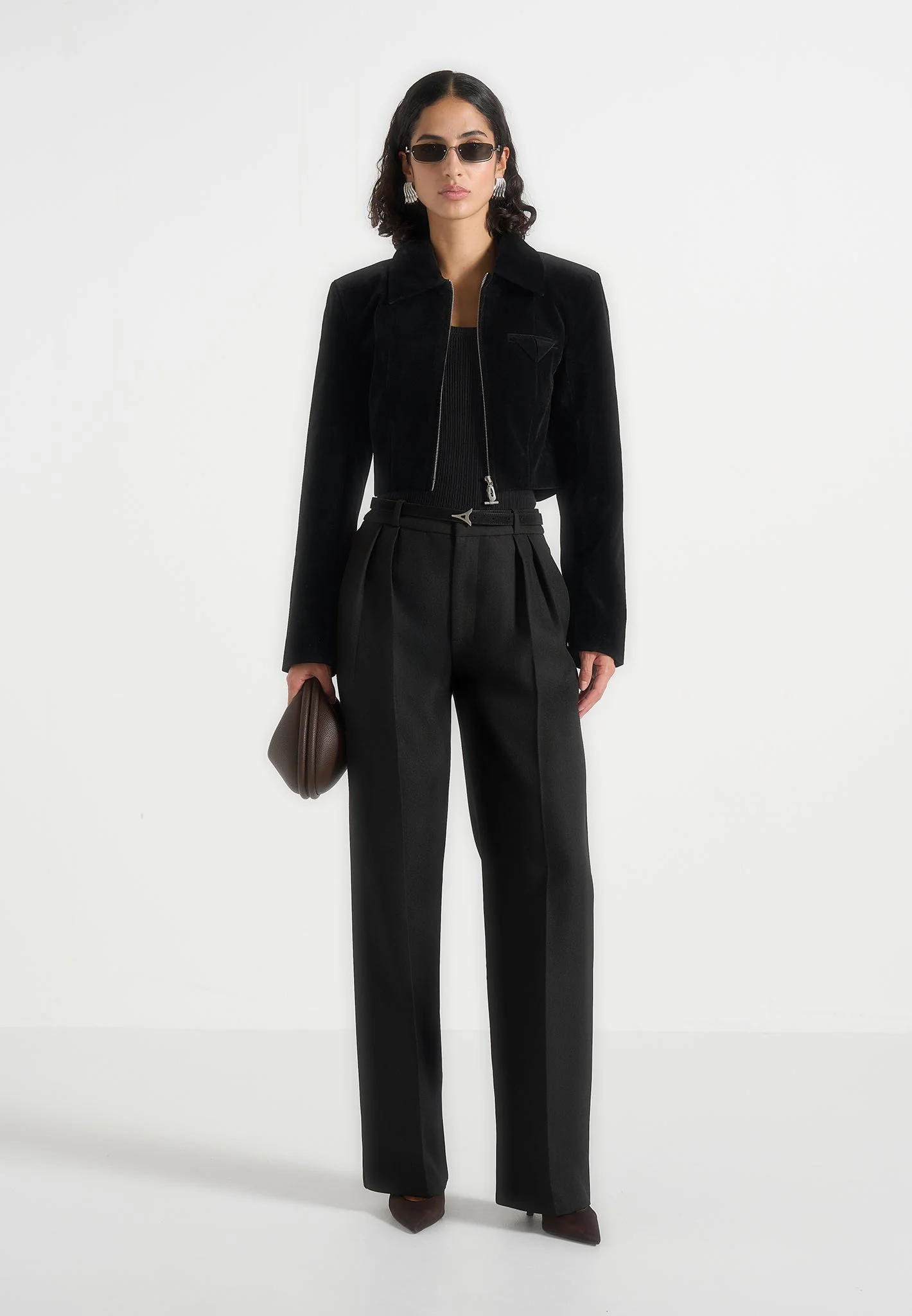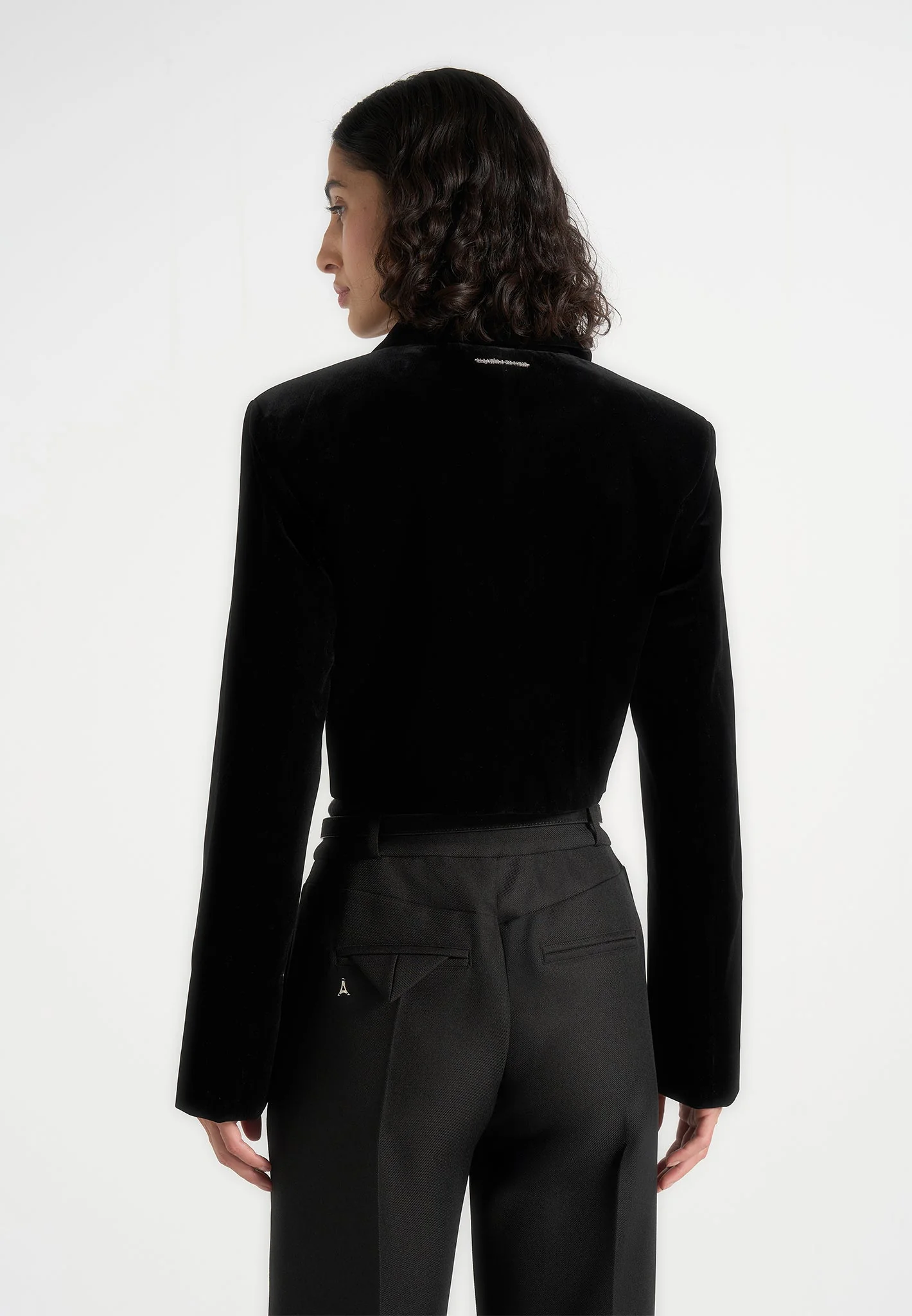 Cut from velvet fabric, this jacket delivers a soft finish with a subtle sheen that feels both modern and elevated. Silver hardware accents bring a polished statement edge, while the dual-zip fastening allows for versatile styling. Complete with a front welt pocket for a clean, functional touch, it blends refined detail with everyday wearability.