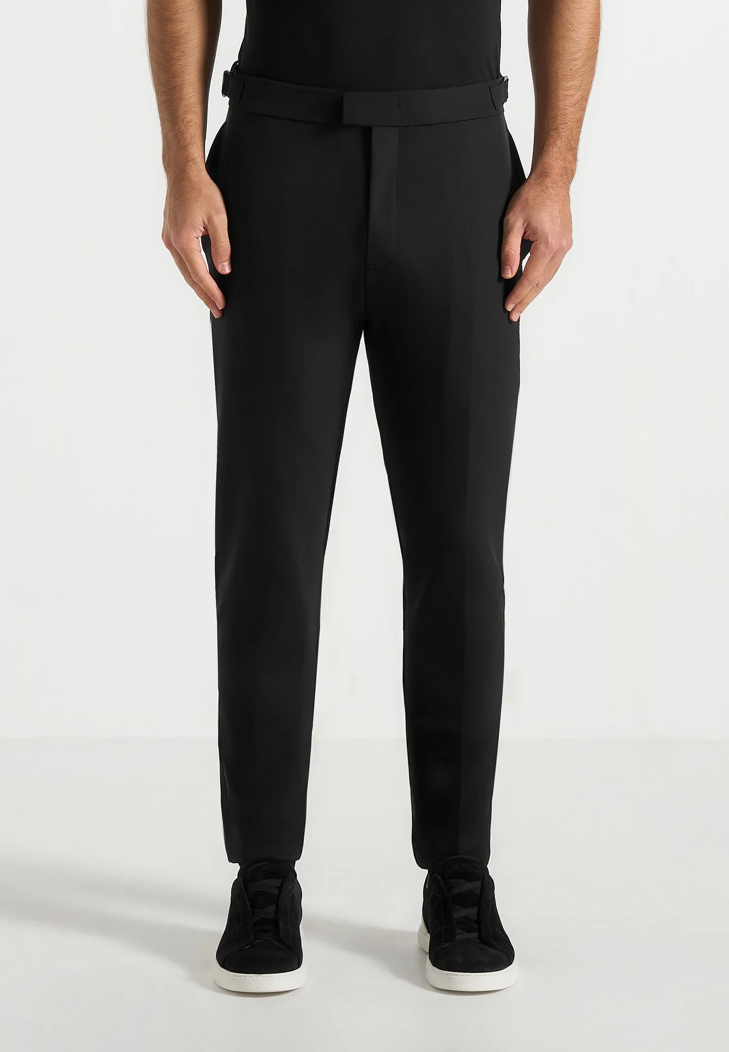 Crafted from a high-stretch fabric, these trousers move beyond traditional tailoring by combining comfort with a clean, refined silhouette. The added elasticity delivers easy movement while maintaining structure. Cut to a slim fit with sharp pleat-to-crease detailing, they’re finished with adjustable waist tabs for a personalised fit and angular welt back pockets. Classic in appearance but more flexible in wear, they’re a versatile alternative to standard tailored styles.