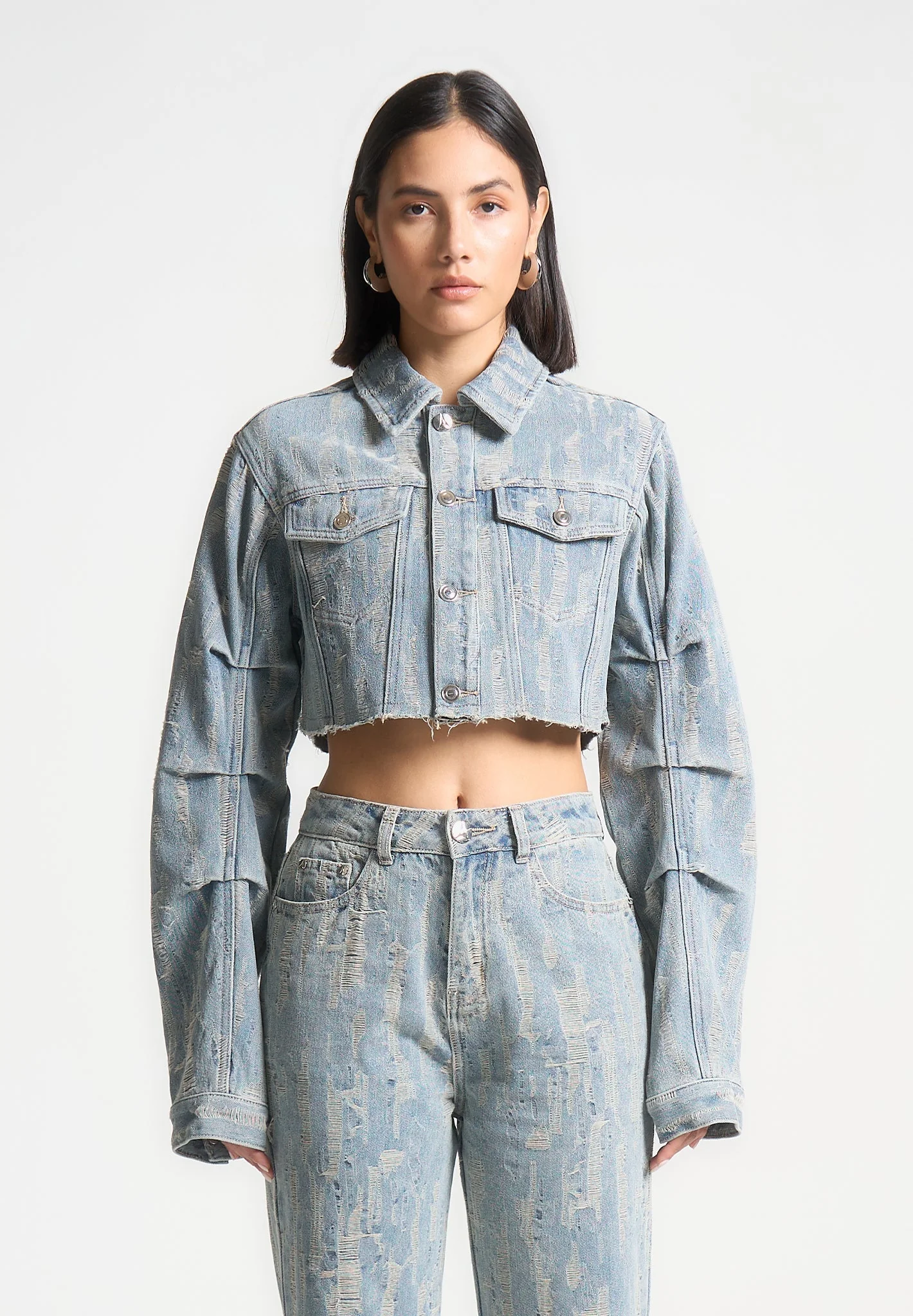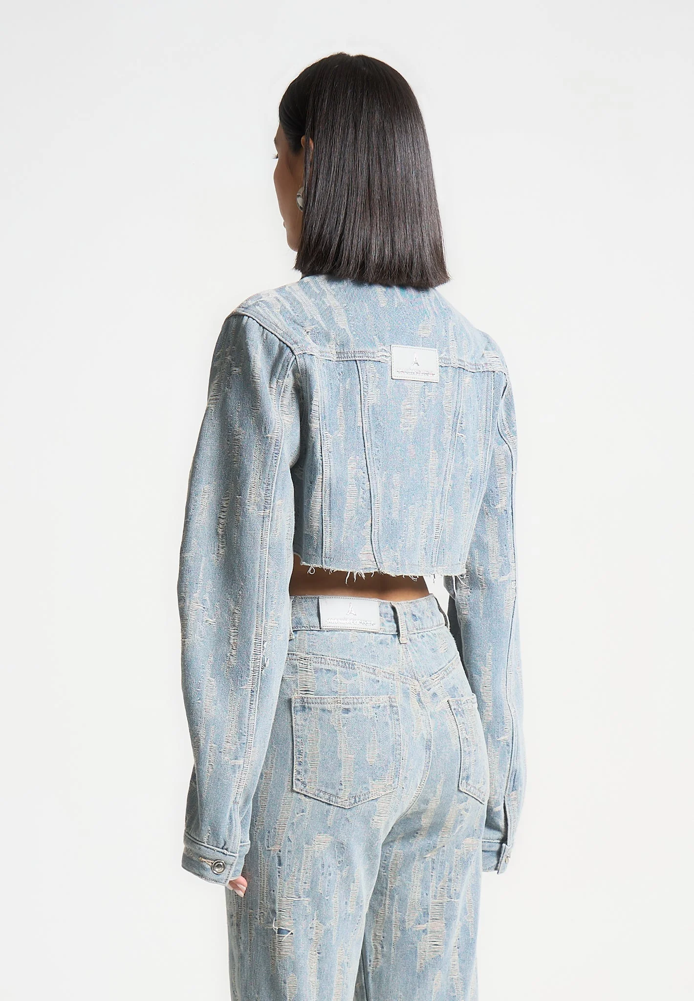 Alice – Cropped Distressed Denim Jacket – Mid Blue