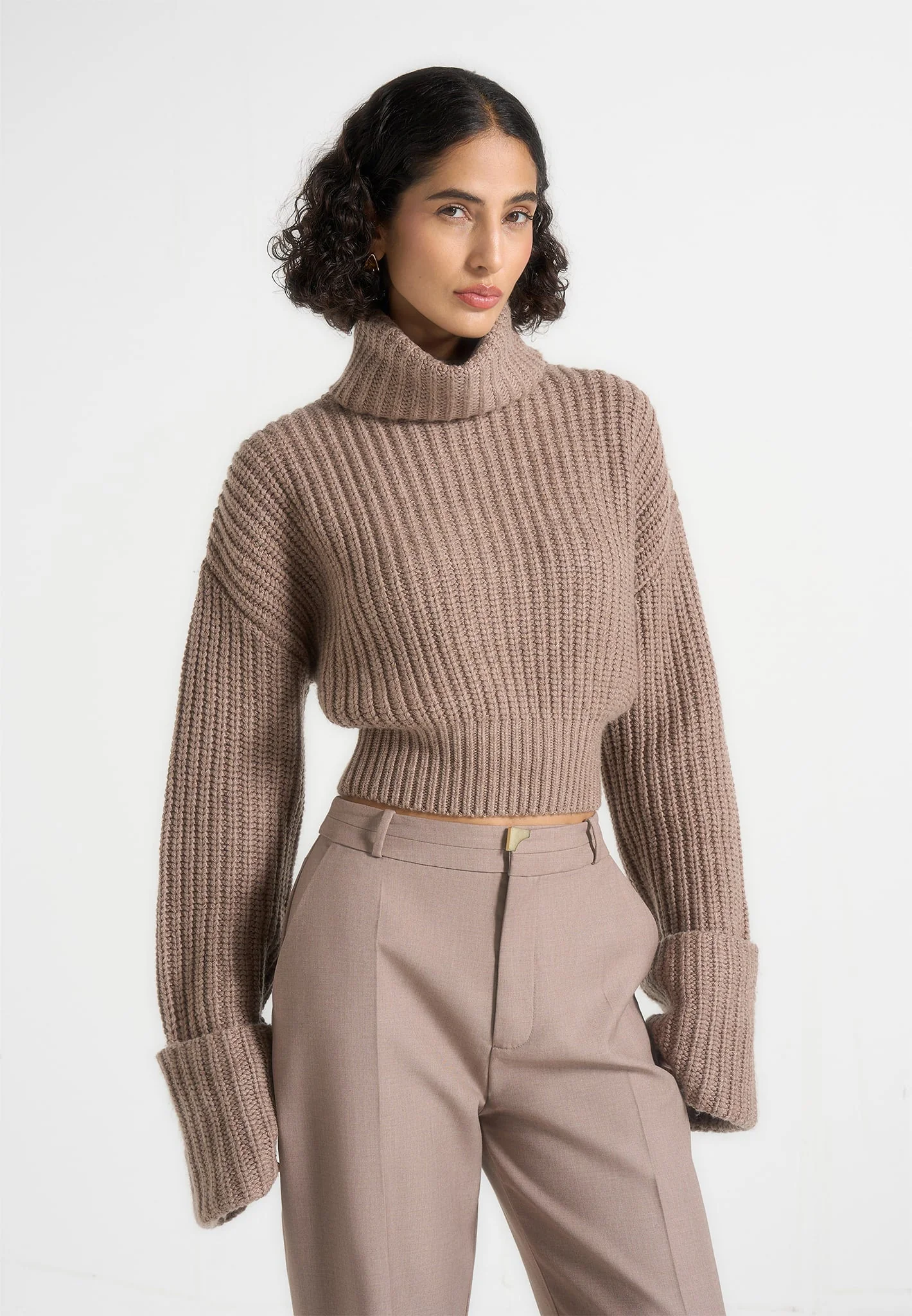 Cut from soft knit fabric, this piece delivers comfort with a refined finish. The roll-neck silhouette adds a clean, polished edge, balanced by deep cuffs that bring structure and detail to the sleeves. Designed with a cropped shape, it offers a modern, versatile layer that transitions effortlessly across looks.