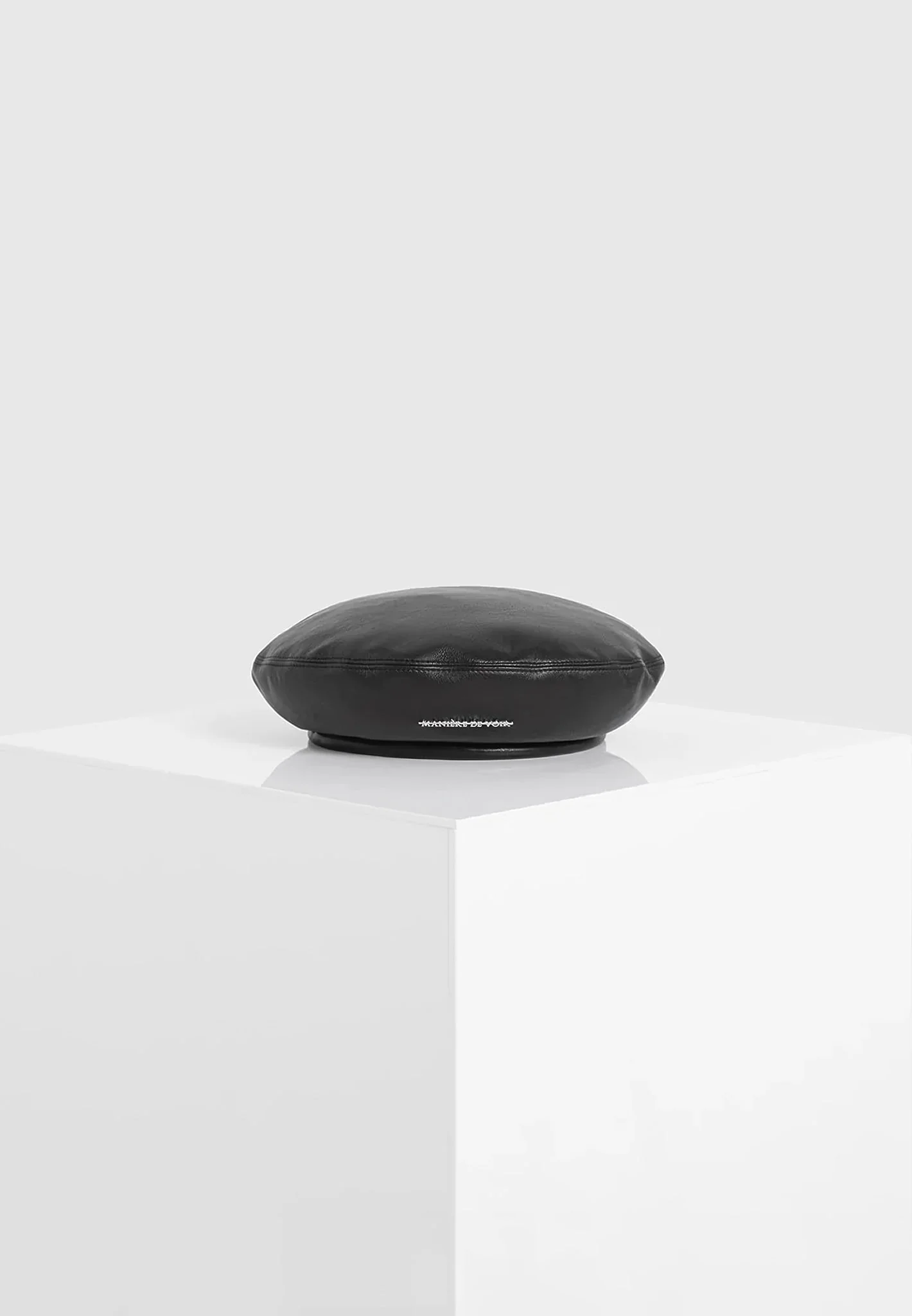 A chic addition to any city outfit, this beret is crafted from vegan leather and has a silver 3D plaque for a clean and minimal aesthetic. Beret Hat Vegan Leather Bungee at Back 3D Silver Manière De Voir Text Plaque