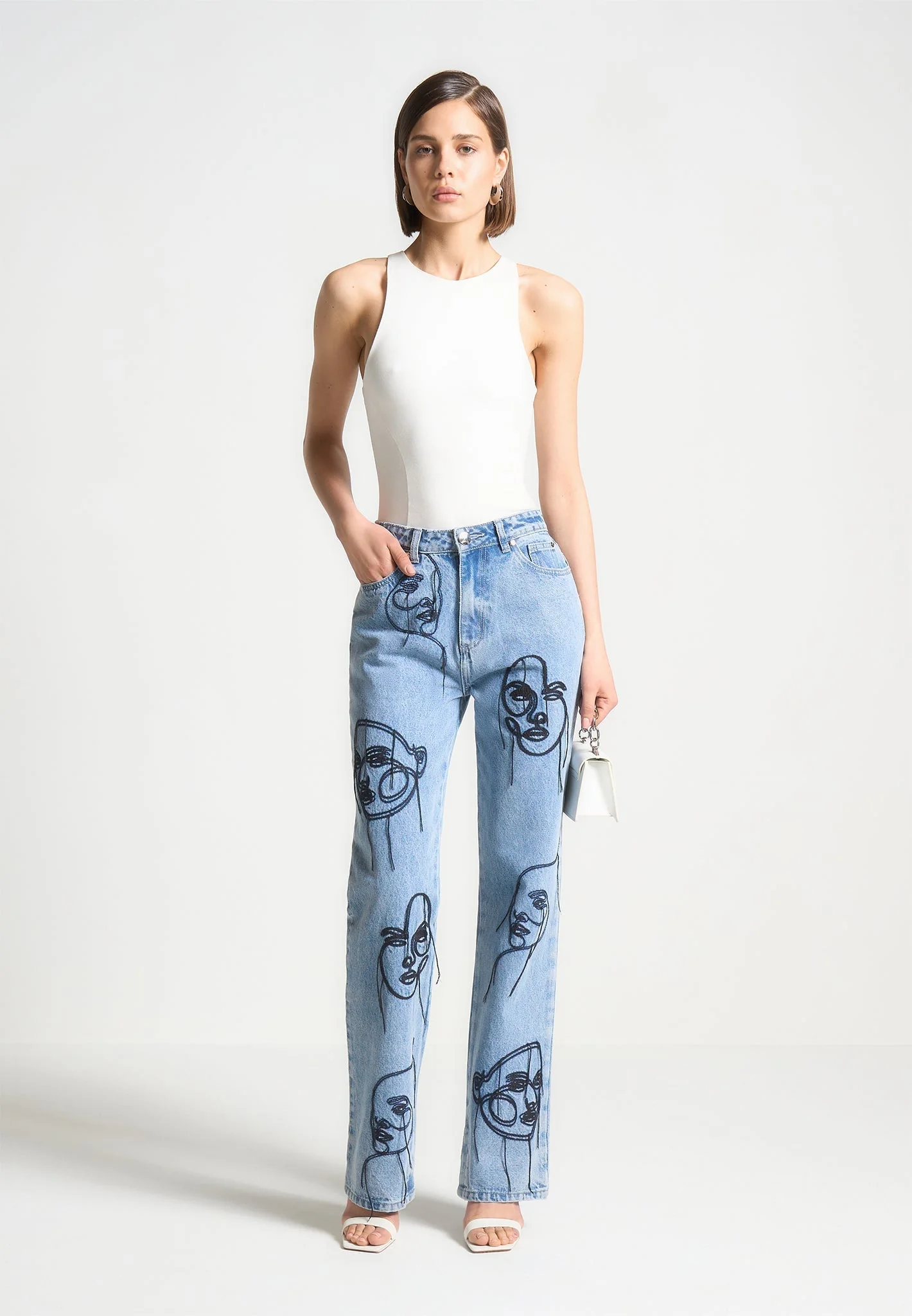 The Line Art Straight Leg Jeans feature a statement design with multiple embroidered Line Art Faces and loose thread detailing. In our classic straight leg fit, they can be dressed up or down. These jeans also feature an internal adjustable waistband allowing for you to have a discretely customised fit.