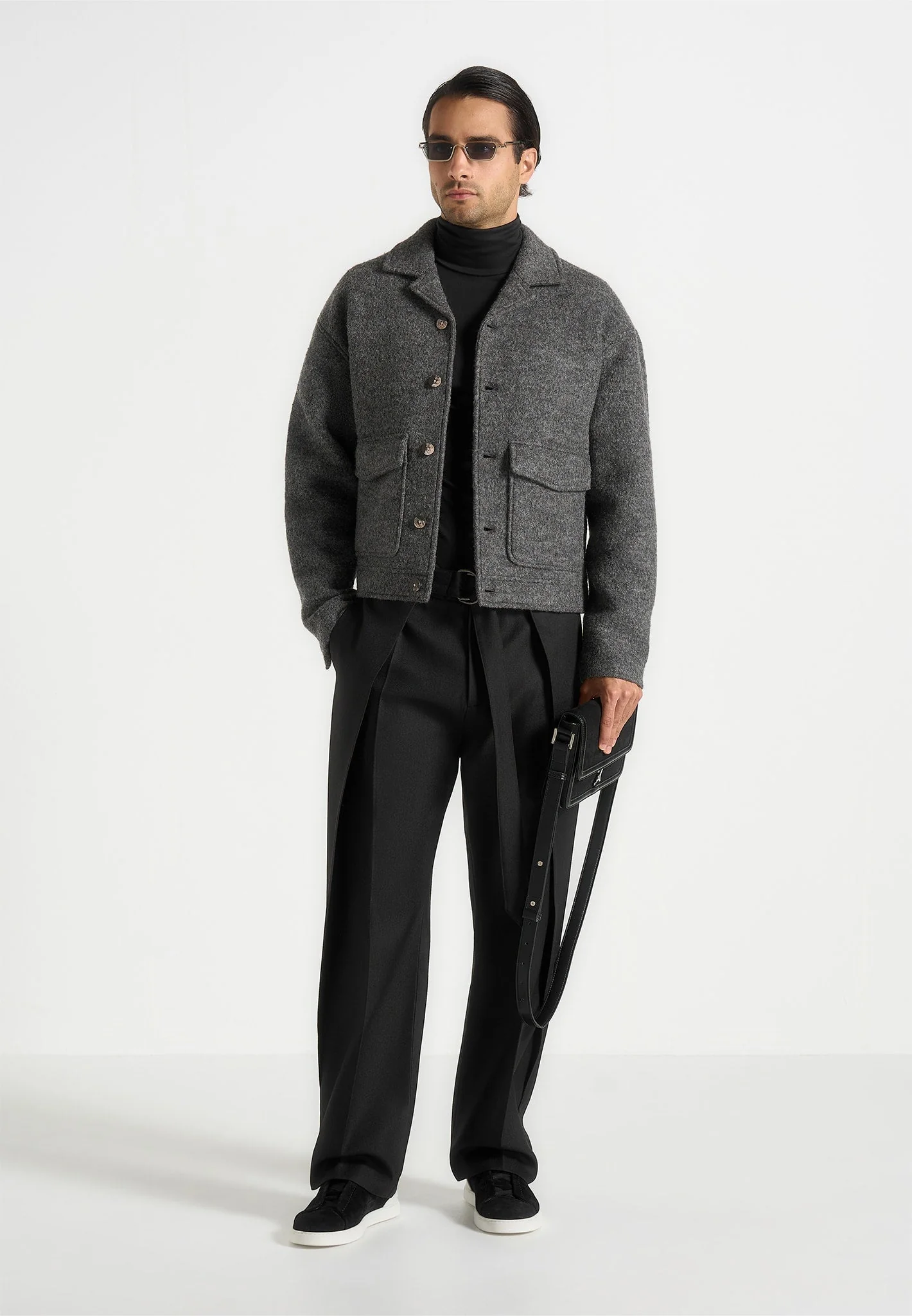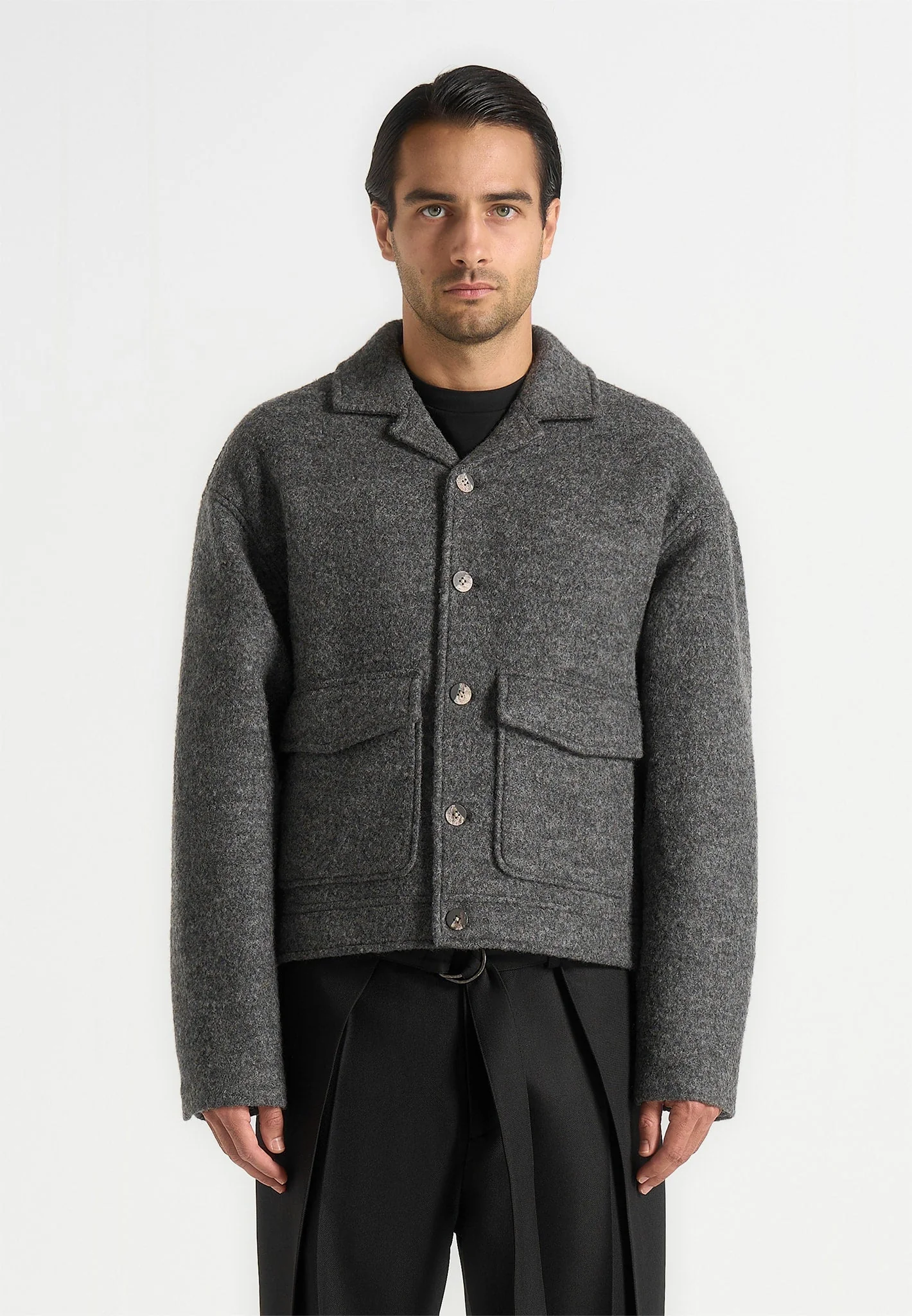 Crafted from wool fabric, this piece delivers a soft yet elevated finish that blends ease with refinement. Designed with functional front pockets, it adds everyday practicality without disrupting the streamlined look. Finished with marble feature buttons for a subtle accent, it’s a versatile layer that transitions effortlessly between casual and refined dressing. Crafted from wool […]
