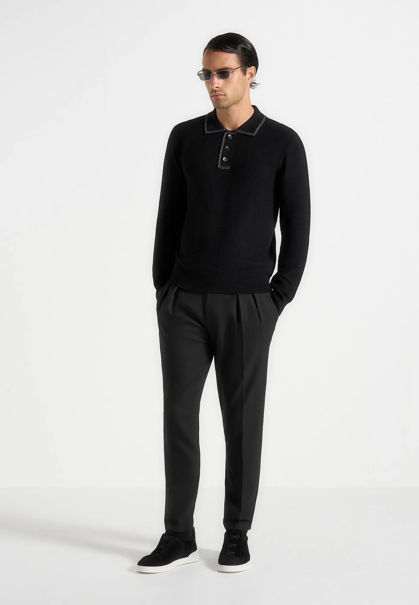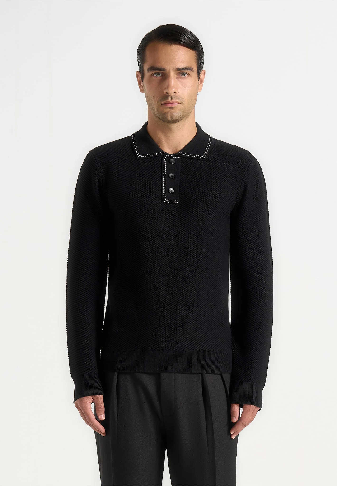 Aymeric – Whipstitch Detail Long Sleeve Knit Polo Shirt – Black