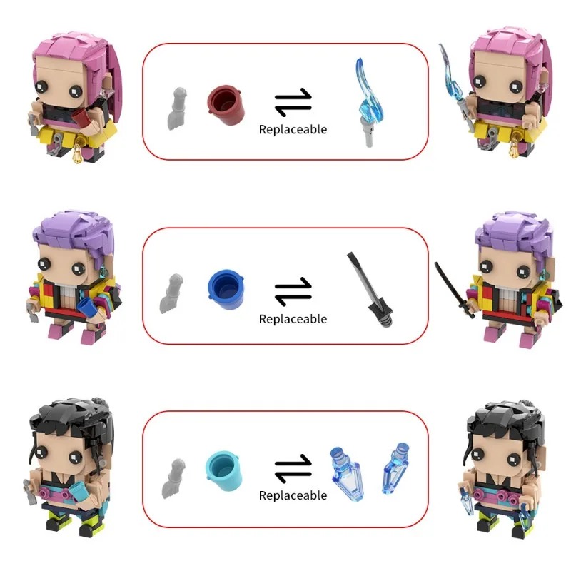 Set de blocs KPOP Demon Hunter – Rumi, Mira & Zoey.Assemblez les trois héroïnes du film Netflix dans une version chibi colorée.Pièces ABS premium, accessoires interchangeables et compatibilité universelle !