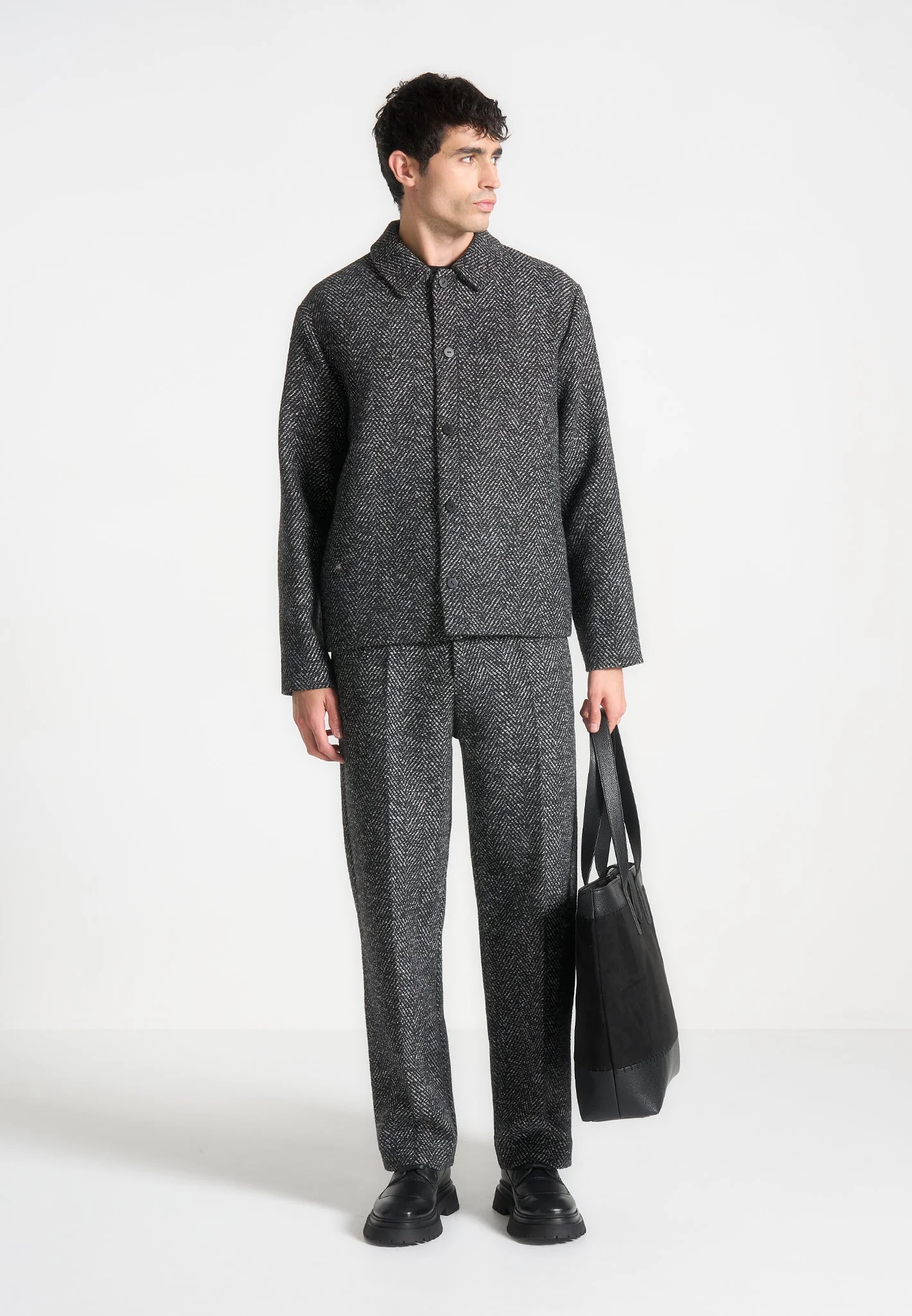 Keep warm and stylish in our Brushed Herringbone Shacket. Crafted in a trucker silhouette, this staple piece is a must-have for any wardrobe. Complete the set with our Wool Herringbone Trousers.