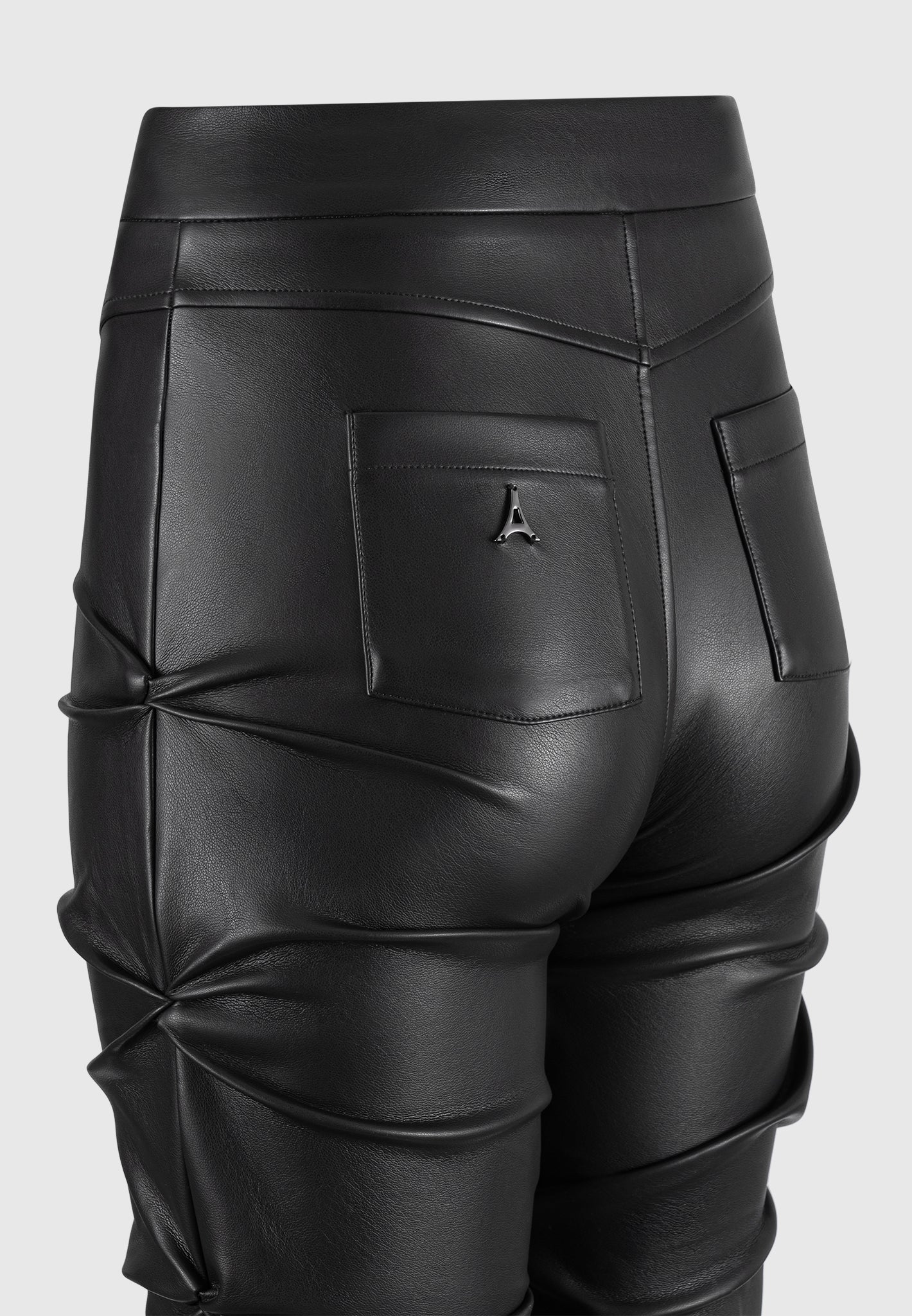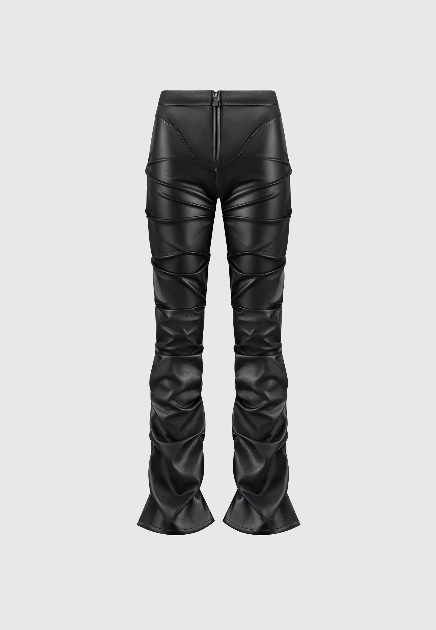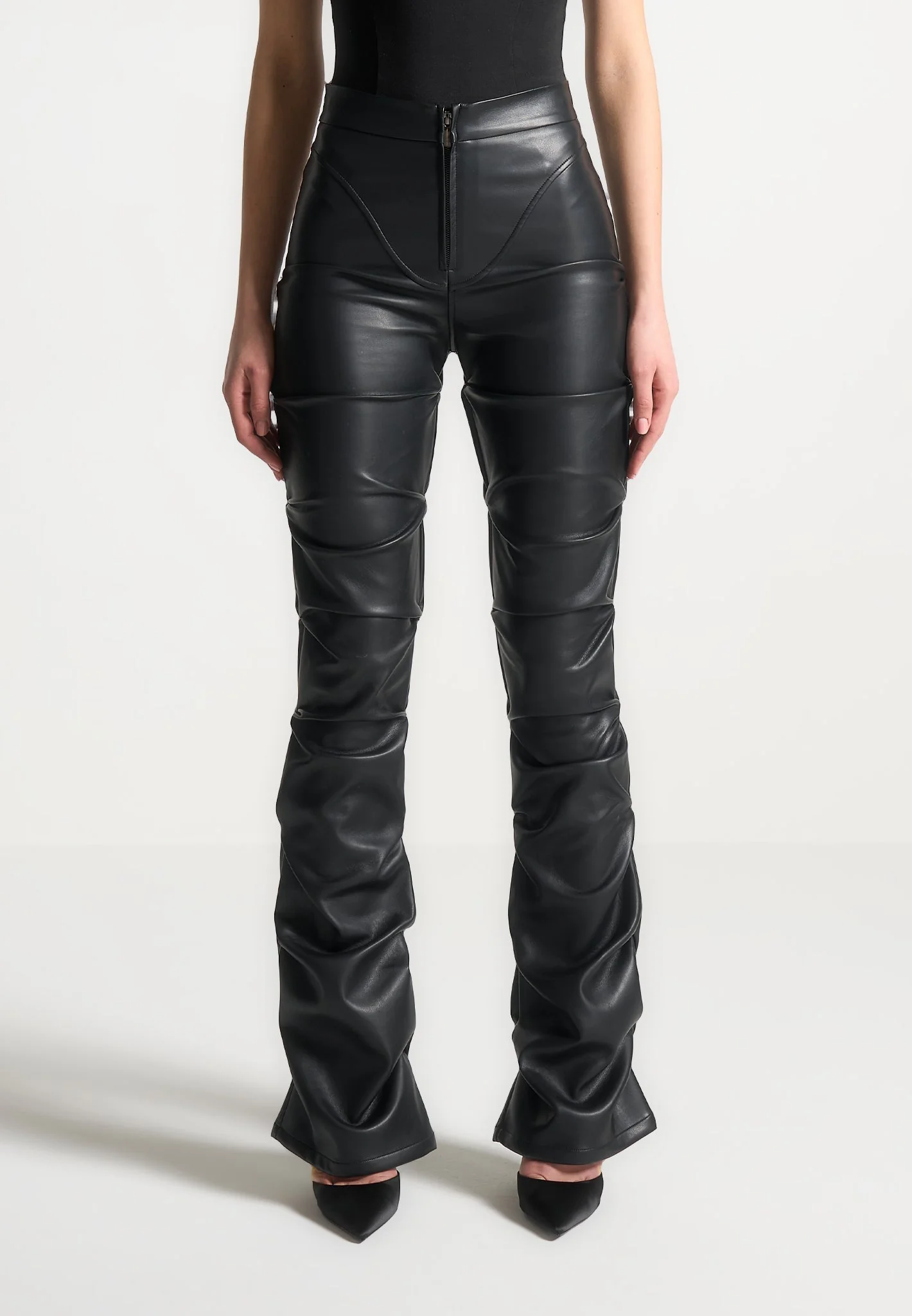 Introducing our classic Vegan Leather Flared Trousers. Featuring tacked detailing and a front functional zip, these trousers will elevate any outfit. Dress them up or down for any occasion. Made from high-quality vegan leather for a stylish and ethically conscious look.