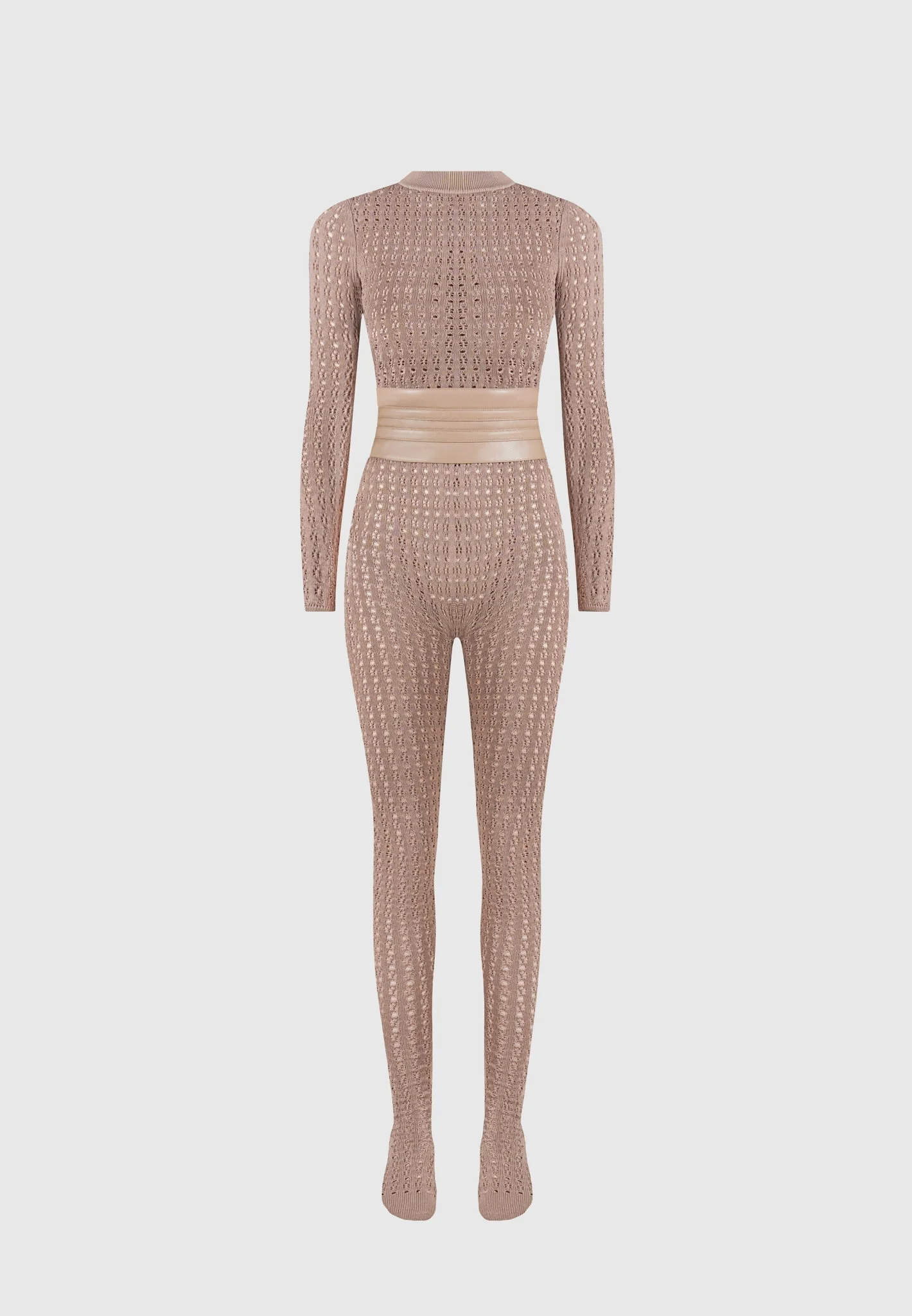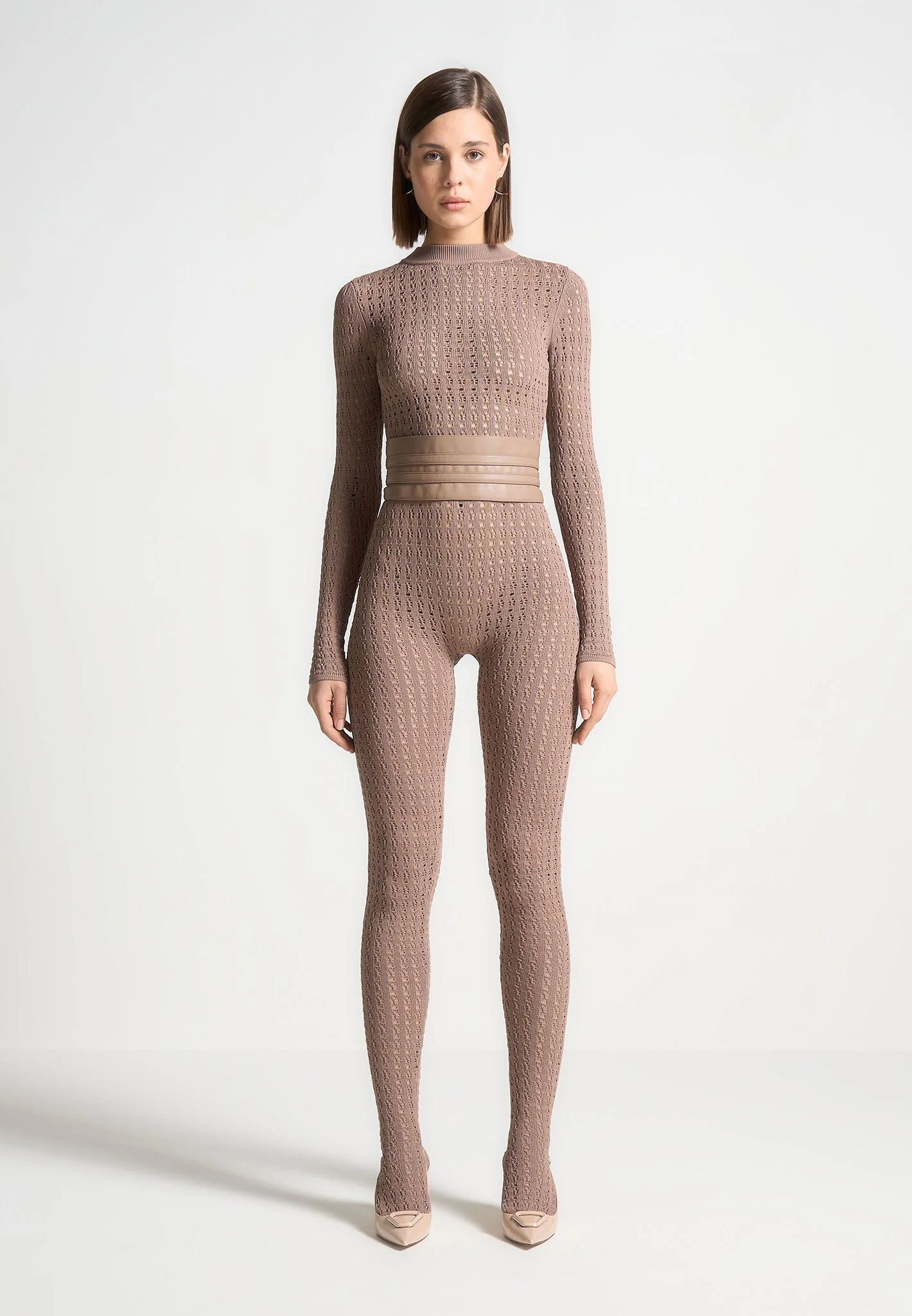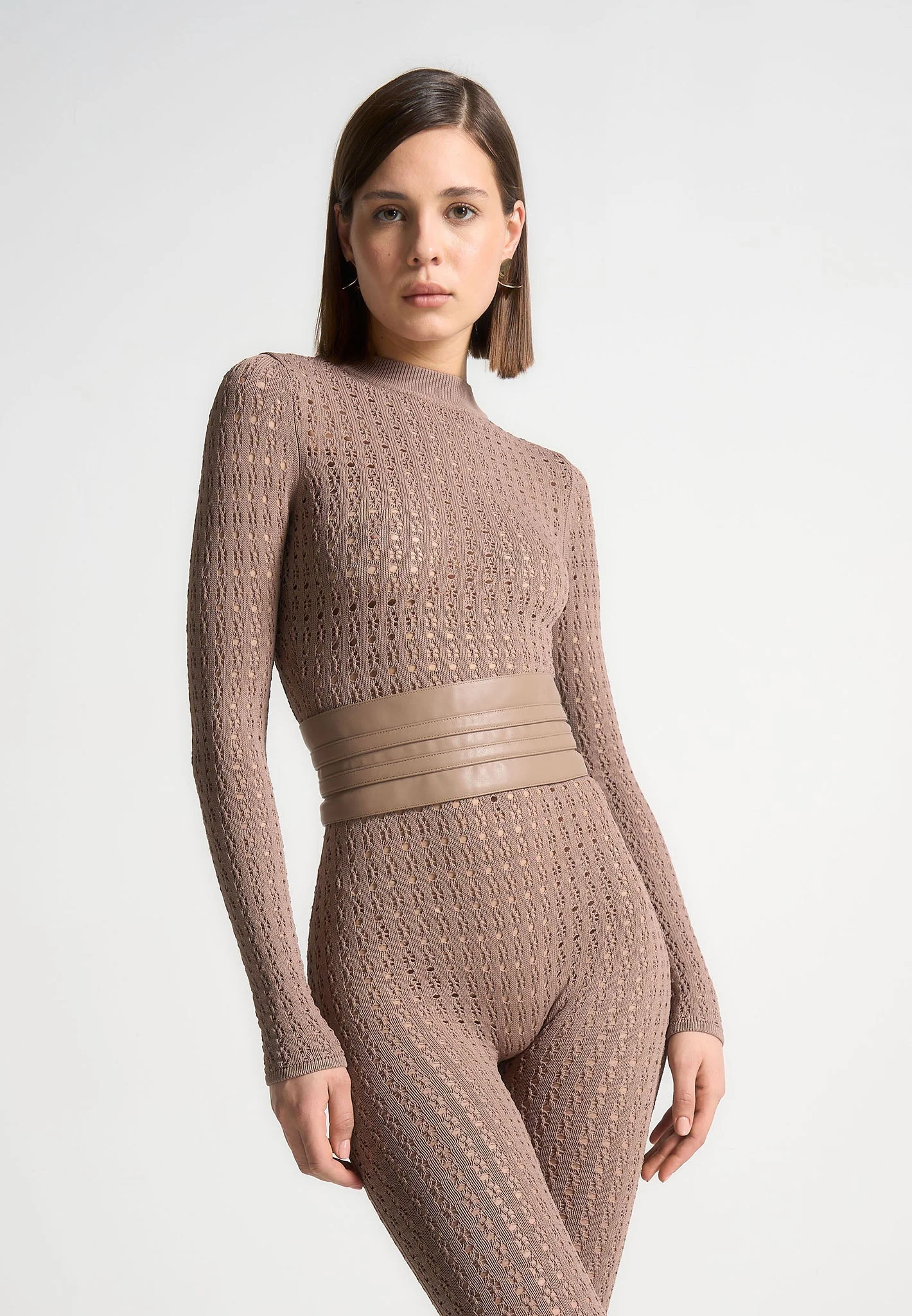 Chantal – Pointelle Knit Long Sleeve Jumpsuit with Belt – Taupe