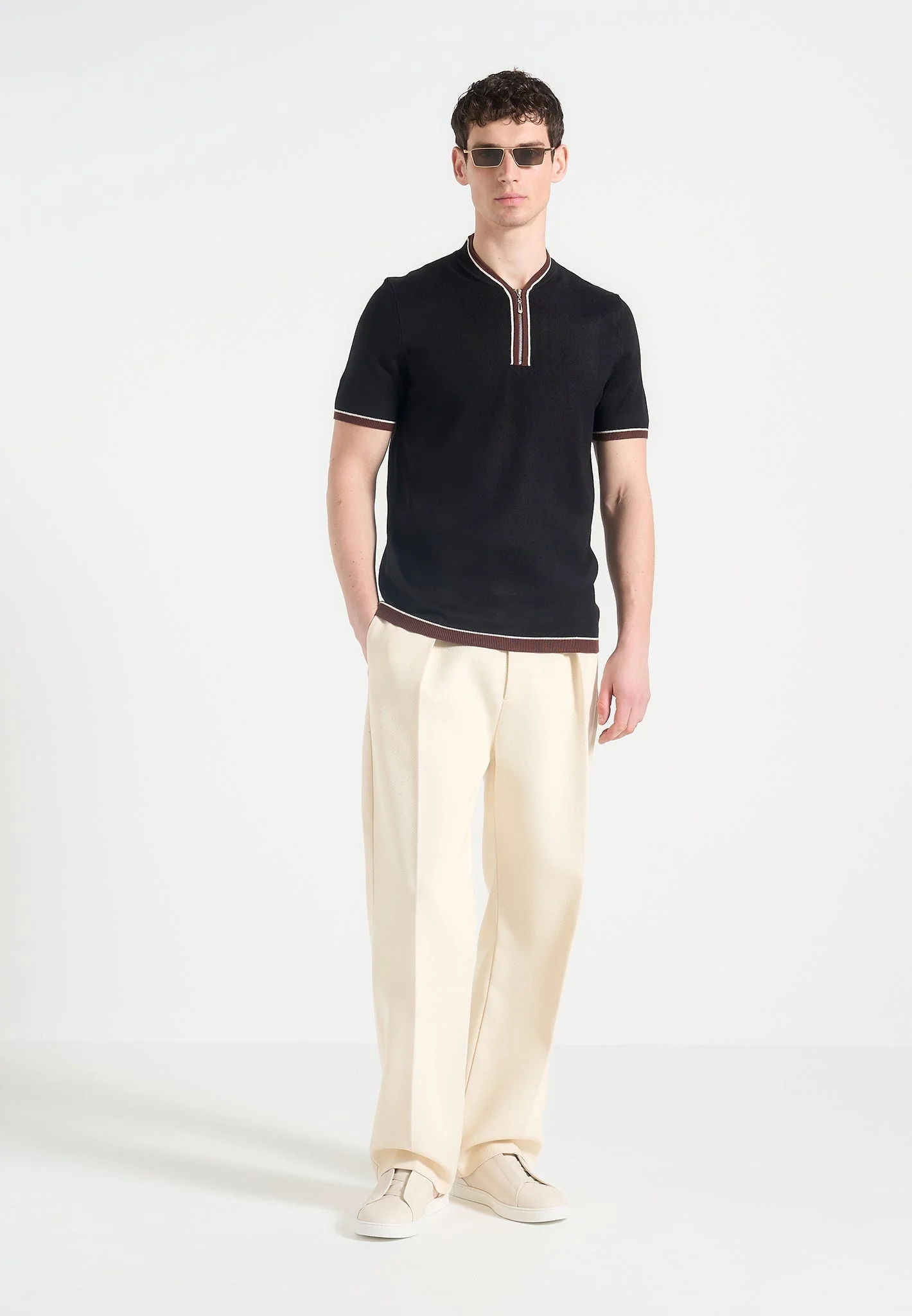 A hybrid of retro sport aesthetics and contemporary tailoring, the Crew Neck Zip Polo Shirt features a distinctive zip neckline framed by contrast taping for a bold vertical focal point. The refined crew collar offers a sleek alternative to traditional polo styling, while its tailored fit and ribbed finishes elevate the knit construction.