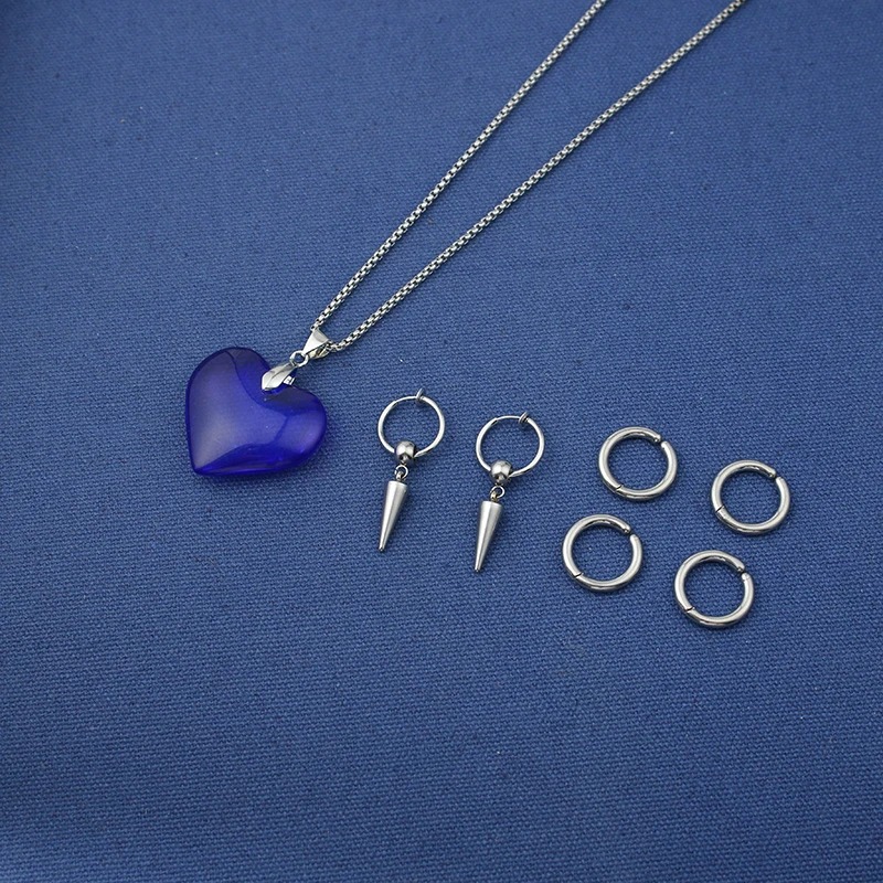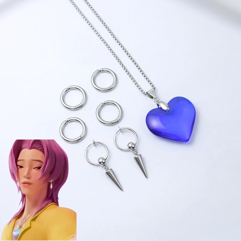 Composé d’un collier à pendentif cœur bleu et de boucles d’oreilles argentées à pointes, ce set capture parfaitement l’énergie élégante et énigmatique du personnage.
