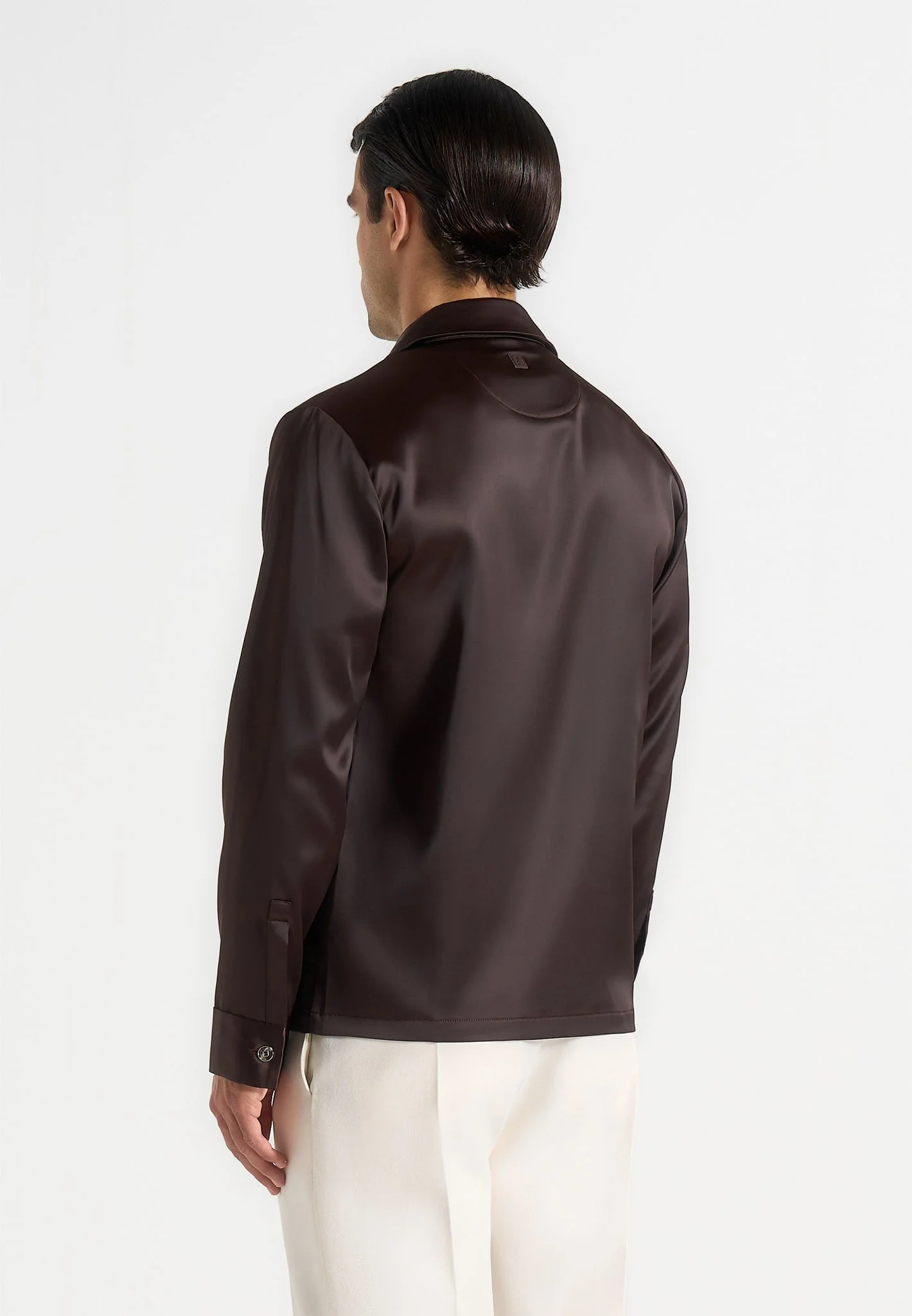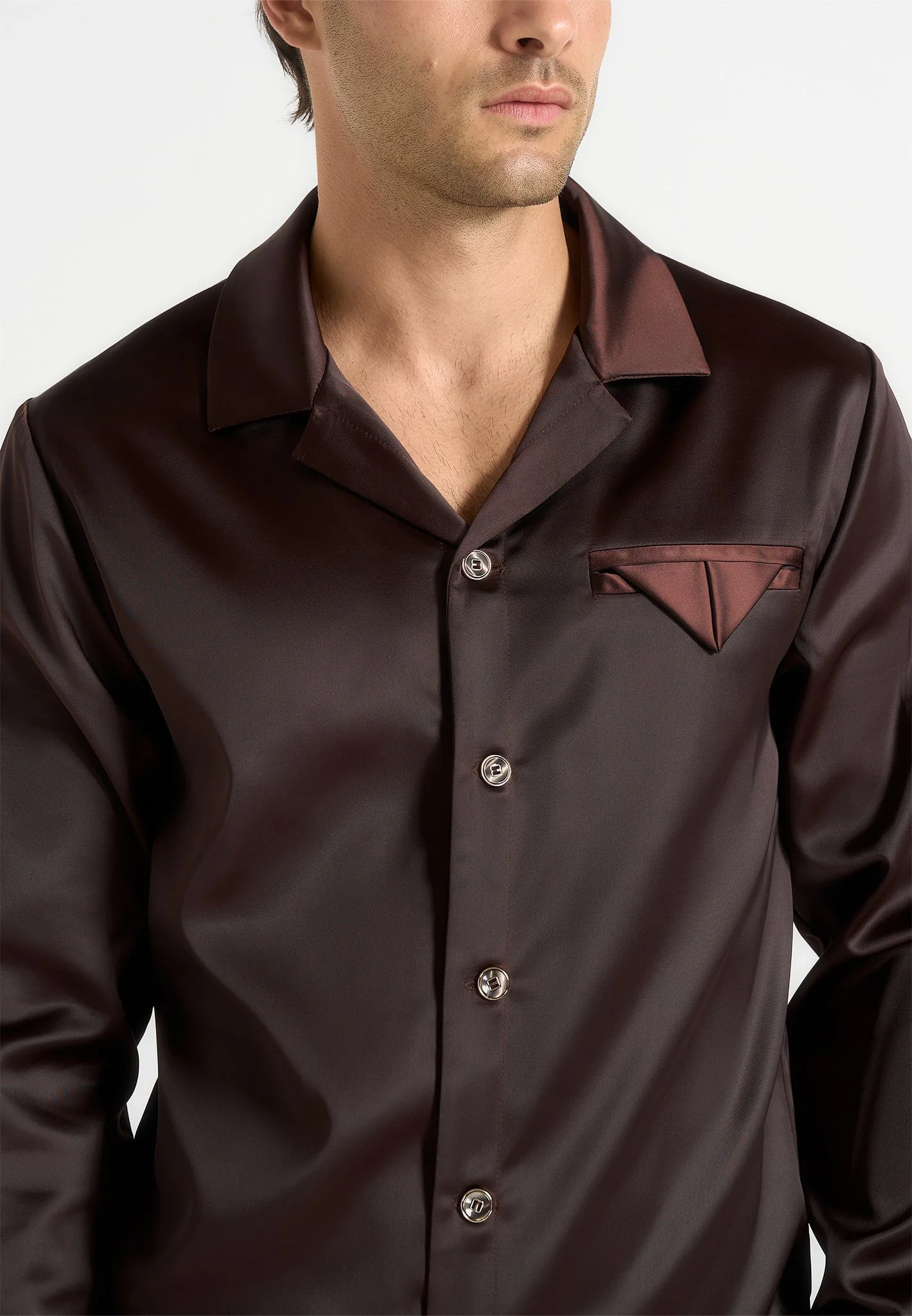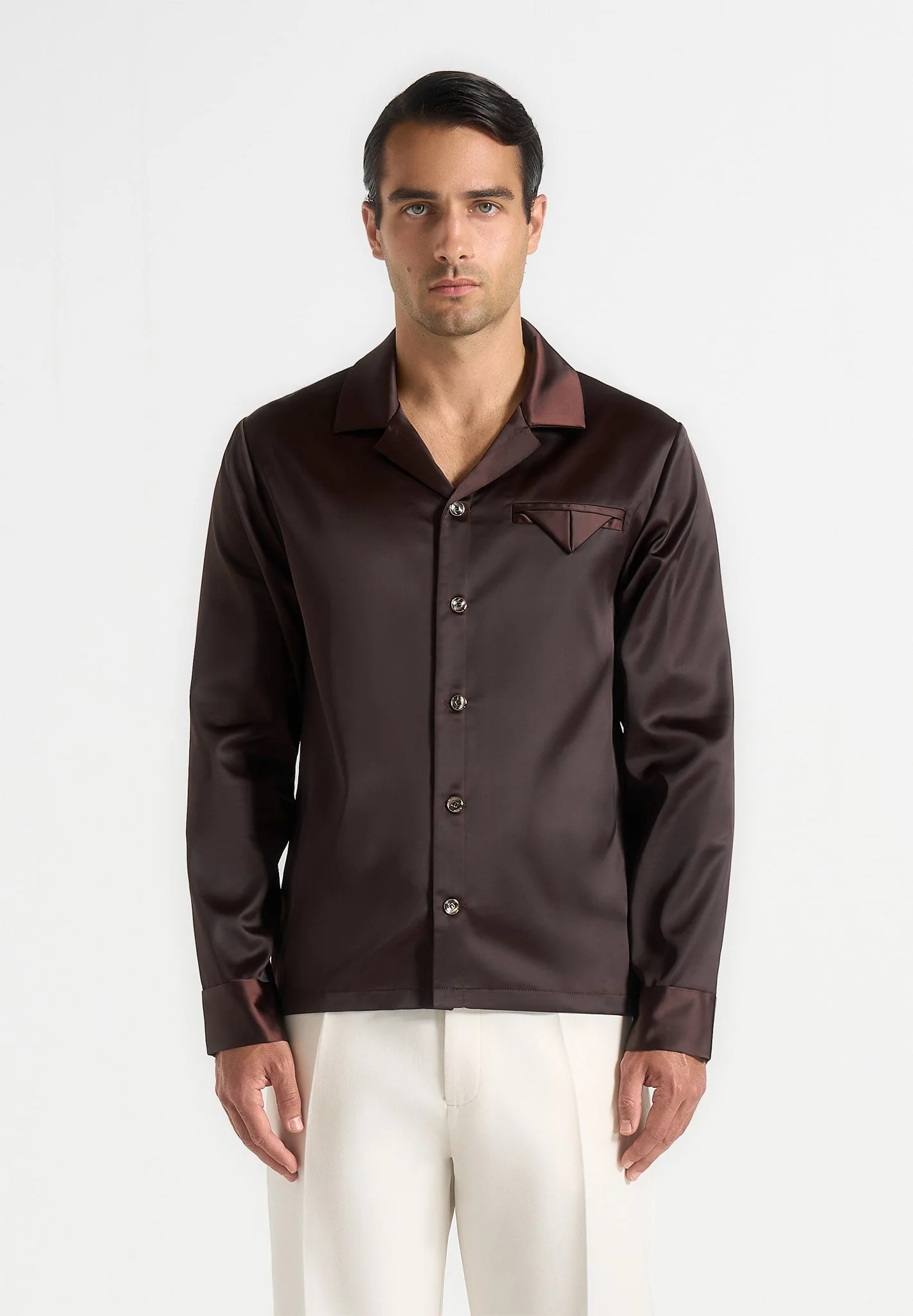 Crafted from high-quality satin fabric, this piece combines a relaxed fit with tailored structure for polished comfort. The revere collar introduces a classic finish, while statement feature buttons add a bold accent. Angular welt chest pocket enhances the design with a modern edge.