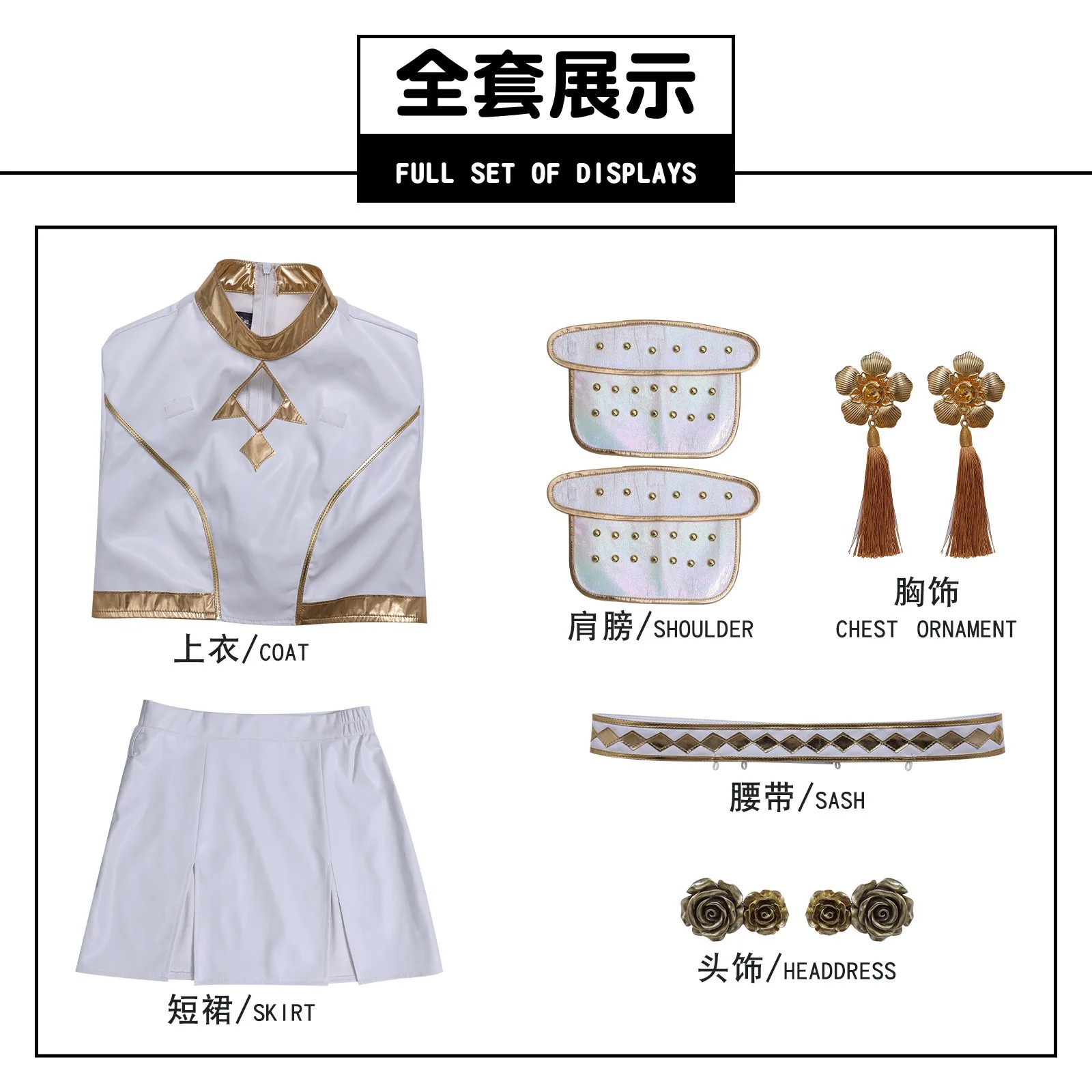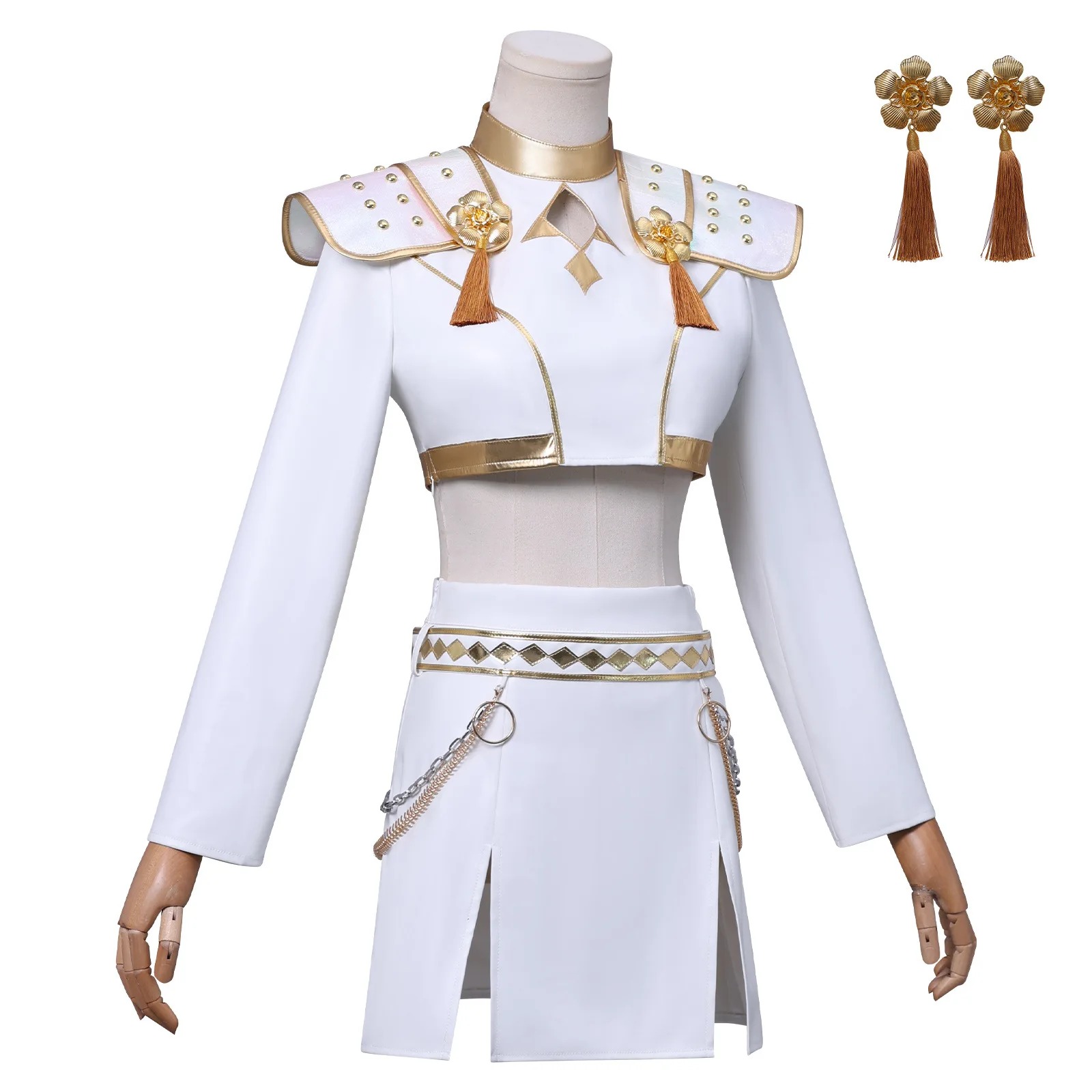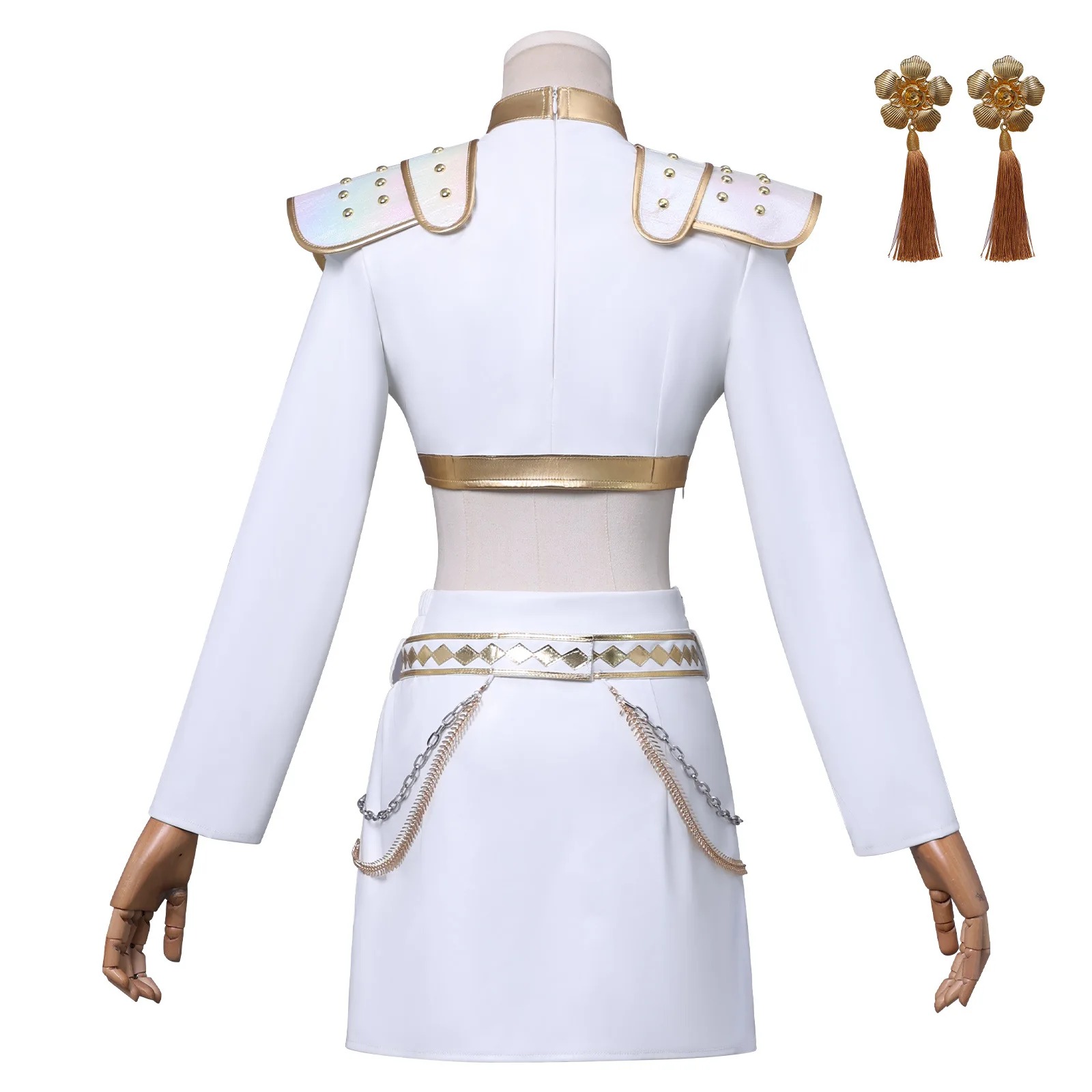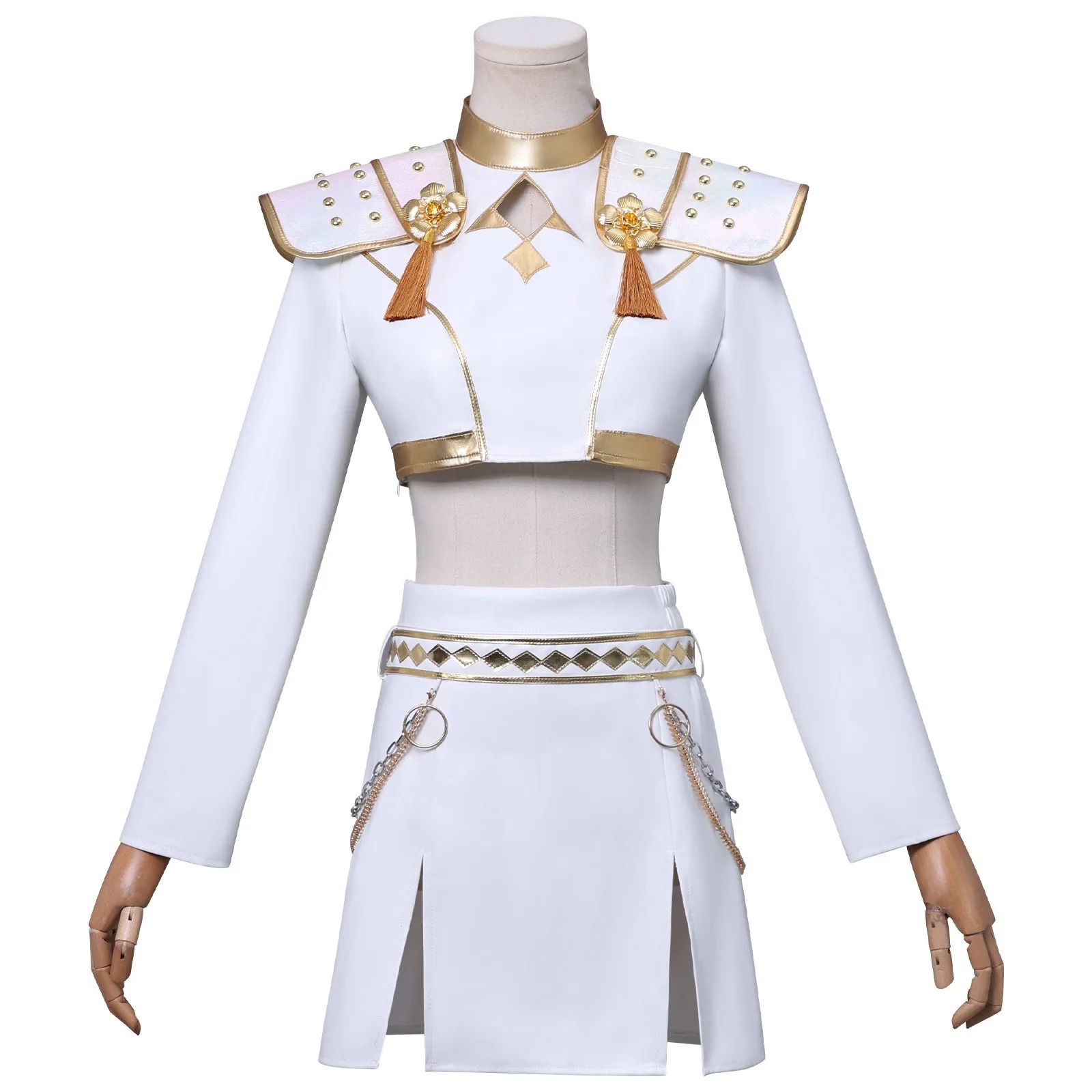 Fabriqué en tissu PU blanc de qualité supérieure, cet uniforme met en valeur des finitions dorées lumineuses et des ornements raffinés, fidèles à la tenue portée par Zoey dans KPOP Demon Hunter. Les épaulettes perlées, les chaînes décoratives et les franges dorées apportent une touche d’élégance scénique unique.