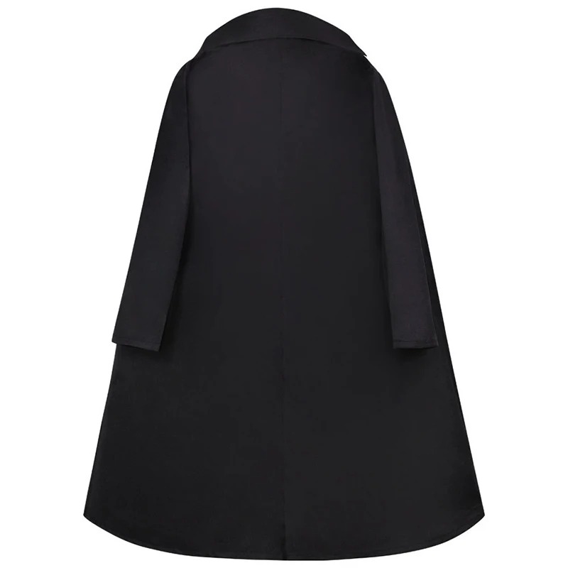 - Le manteau noir est long et a une capuche.