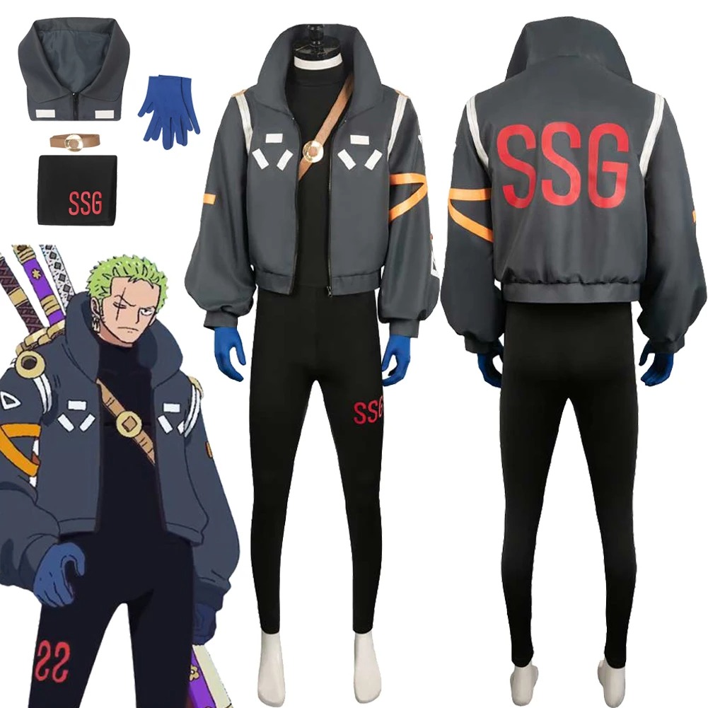 Ce costume de Cosplay Roronoa Zoro Egghead Island SSG est parfait pour tous les fans de One Piece qui veulent se transformer en leur épéiste préféré dans sa nouvelle tenue de l’arc Egghead Island ! Le costume est fabriqué à partir de matériaux de haute qualité et est conçu pour être confortable et durable. Il comprend une combinaison bleue moulante, des gants bleus, une ceinture marron, une veste bleue avec détails blancs inspirée de l’uniforme SSG et motifs futuristes, et trois boucles d’oreilles dorées. Le costume est également livré avec les deux sabres de Zoro : Wado Ichimonji et Enma.