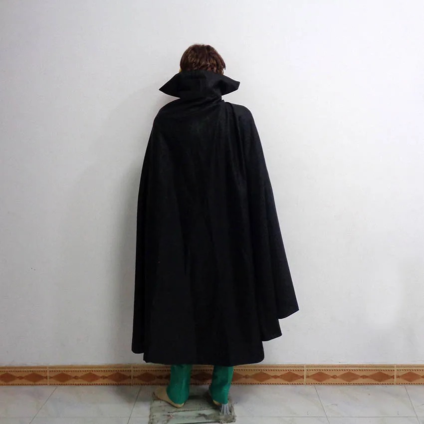 - Manteau : Tissu noir fluide avec col ouvert pour un style imposant