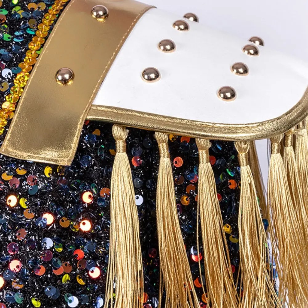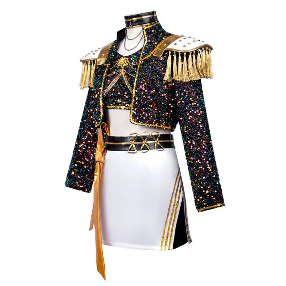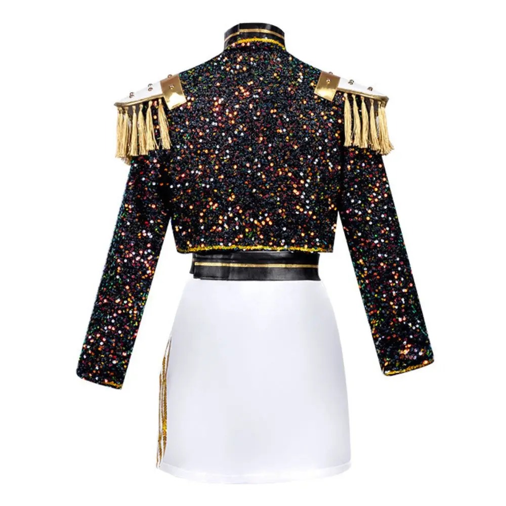 Le costume combine une veste courte noire à paillettes multicolores, une jupe blanche à finitions dorées, et de magnifiques épaulettes à franges dorées, évoquant l’allure d’une véritable star K-pop. Les chaînes décoratives, les broderies brillantes et les ornements métalliques apportent un rendu haut de gamme, parfait pour les enfants passionnés de danse, de spectacle ou de cosplay.