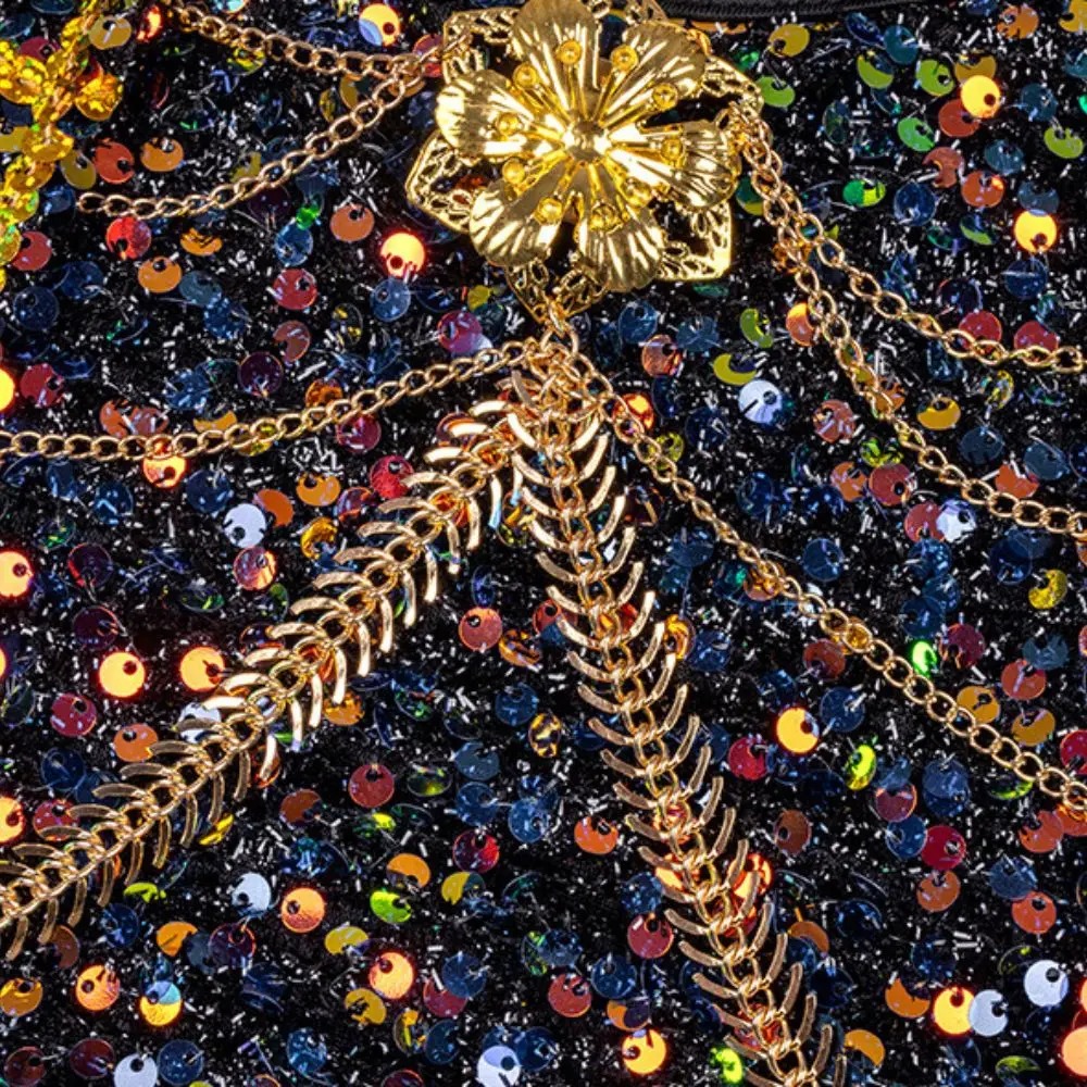 Matériaux : polyester premium, similicuir doré et tissu scintillant