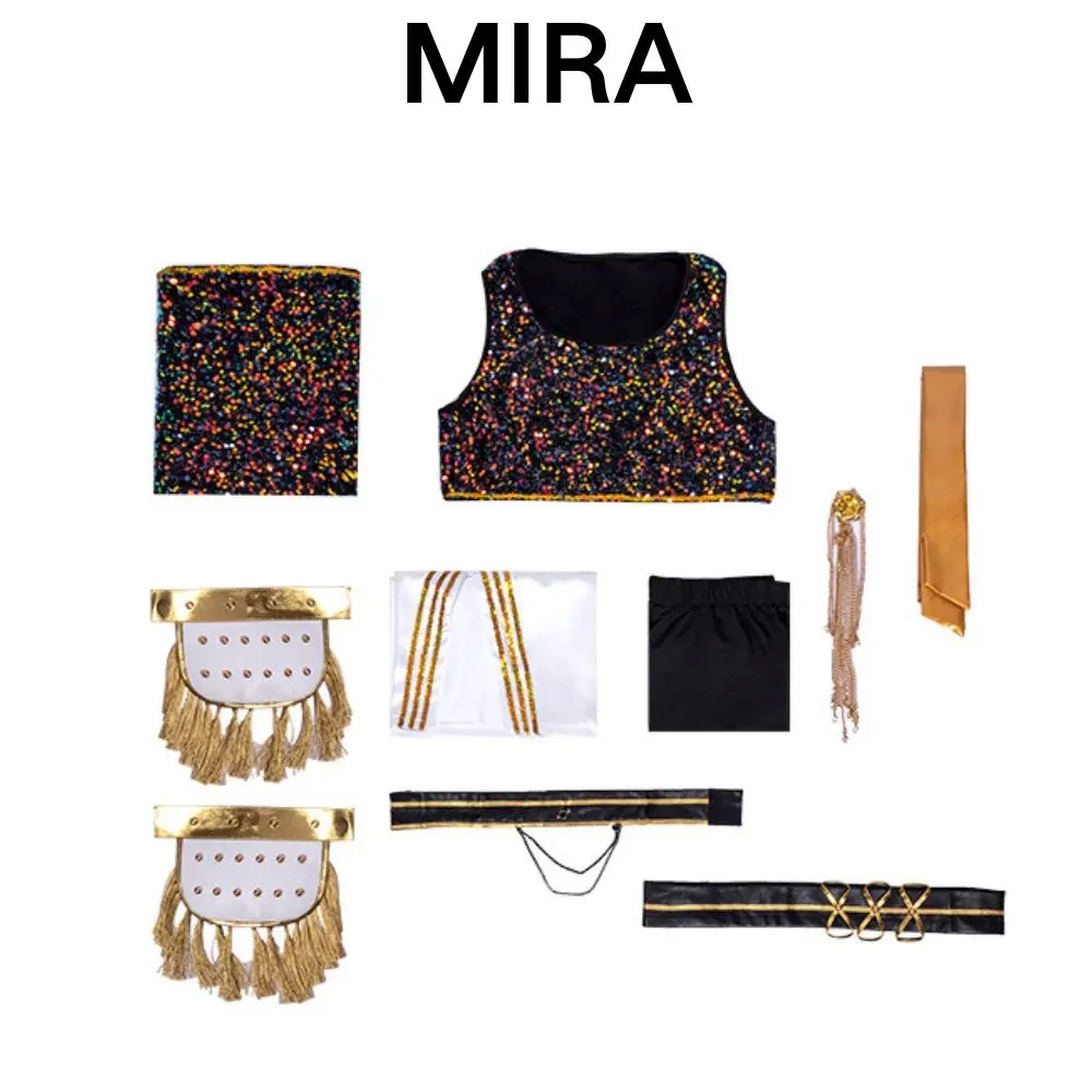 Éblouissante et audacieuse, cette tenue reprend le style charismatique de Mira, la chanteuse guerrière au look royal et scintillant.