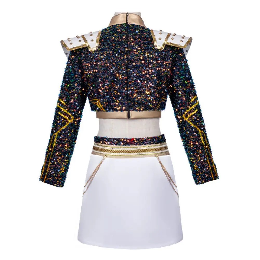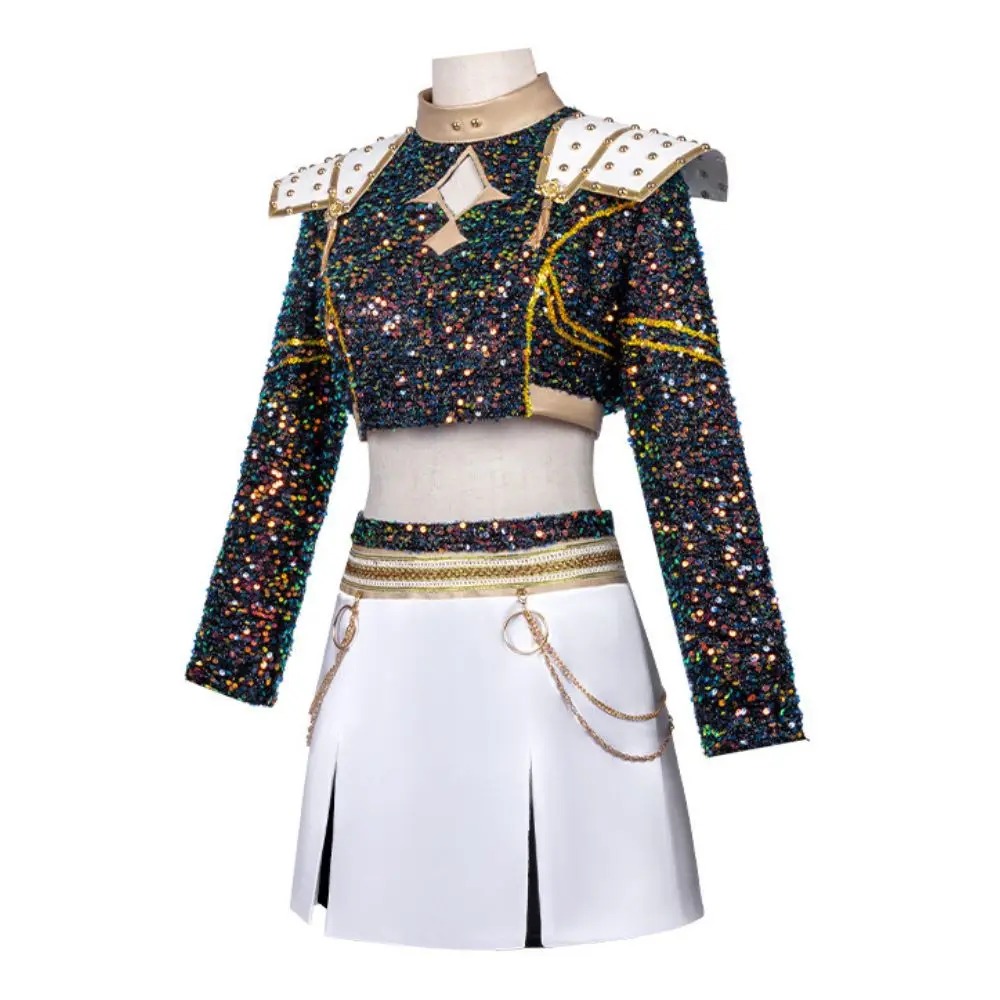 Cette tenue spectaculaire combine paillettes, élégance et énergie, recréant à la perfection le style unique des chasseuses de démons de l’univers KPOP Demon Hunter.