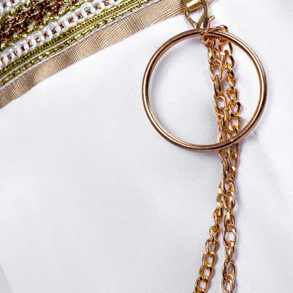 La veste courte scintillante et la jupe blanche à détails dorés forment un ensemble harmonieux, à la fois chic et plein de caractère. Les chaînes décoratives, broderies fines et épaulettes dorées ajoutent une touche de puissance et de modernité, fidèle à l’esprit du film.