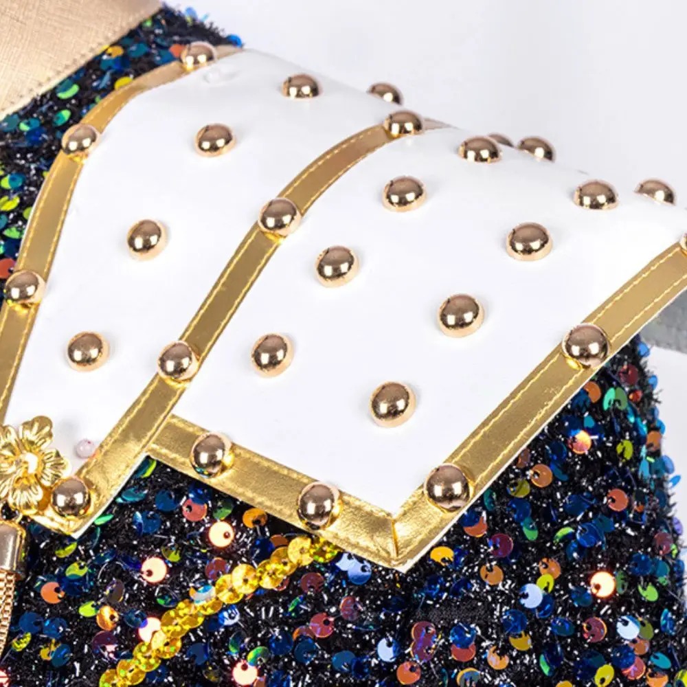 Ensemble complet : veste pailletée, jupe blanche, épaulettes et accessoires dorés