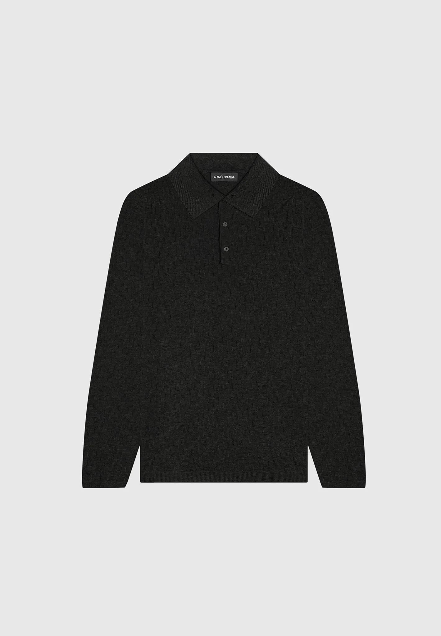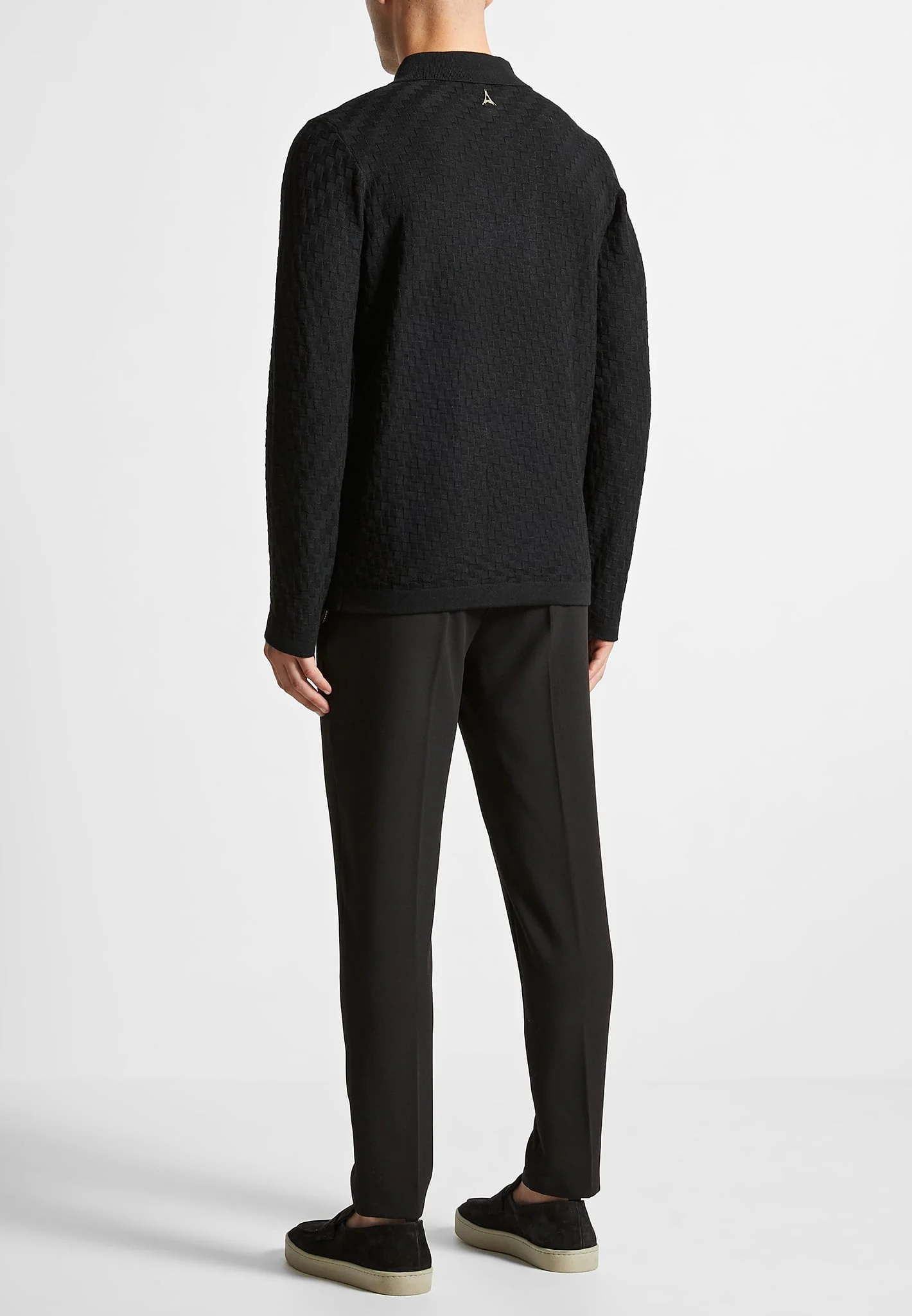 Cotton Blend Waffle Knit Long Sleeve Polo Top – Black