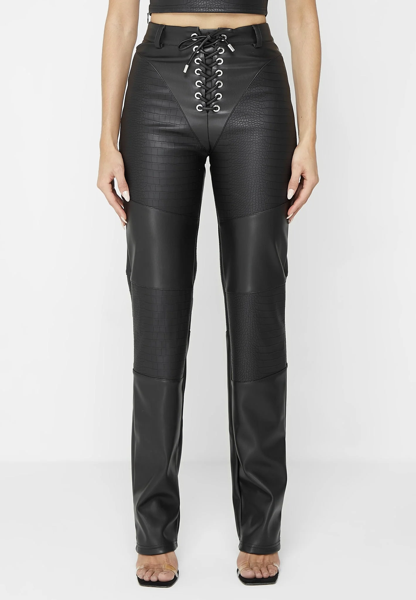 Croc Embossed Lace Up Trousers – Black