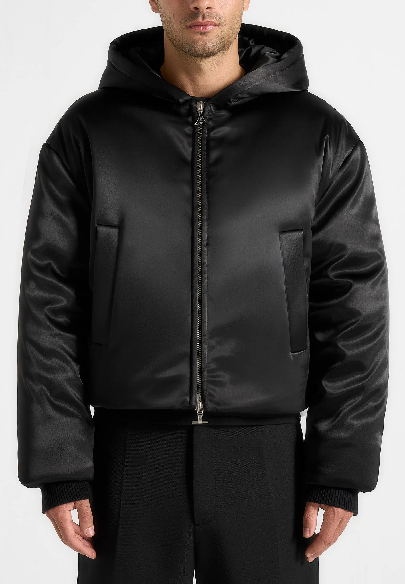 Designed with a hooded silhouette, this piece delivers a relaxed yet functional look. The satin finish introduces a smooth, elevated touch, while the regular fit ensures all-day comfort and easy layering. A dual-zip fastening with silver Eiffel detail adds a signature accent, complemented by functional front pockets for everyday convenience.