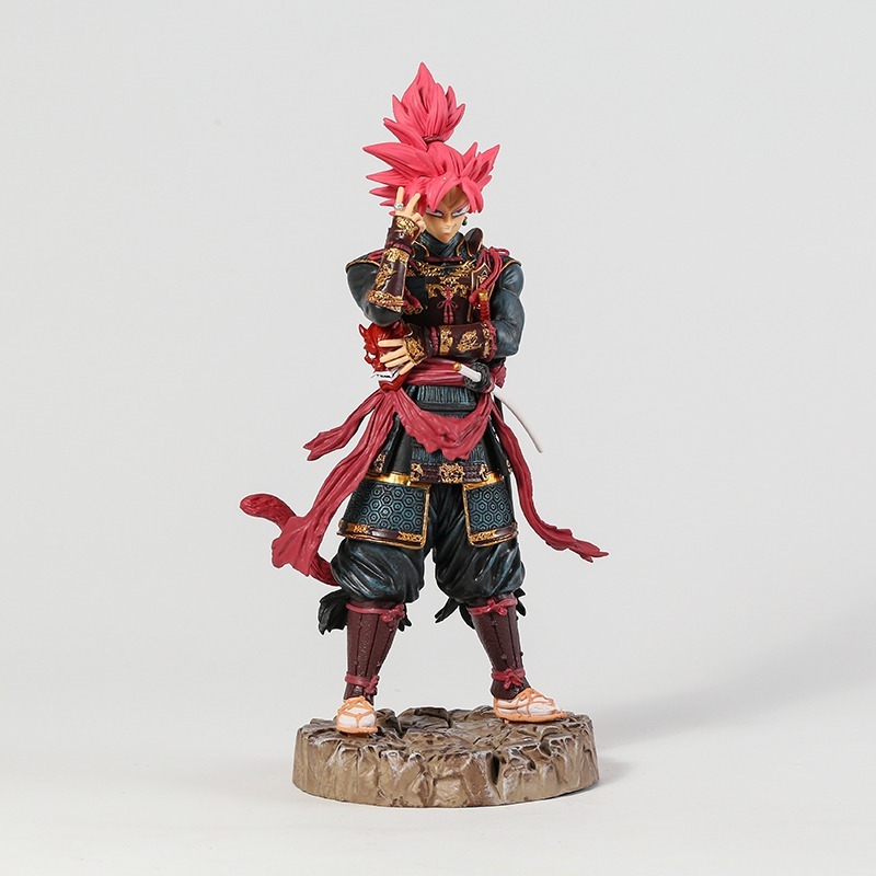 Figurine Dragon Ball Super Black Goku Super Saiyan Rose style de Samouraï mesure 31 cm de haut et est faite en PVC. Elle présente Goku Black vêtu d’une armure de samouraï noire avec des lignes rouges, une ceinture rouge et un masque de démon rouge. Il contient également une épée dans sa ceinture. La figurine est très détaillée, avec une grande attention portée aux plis et textures de l’armure, ainsi qu’aux détails de l’épée. Les couleurs sont vives et fidèles à l’apparence de Goku Black dans la série. Globalement, c’est une figurine impressionnante pour les fans de Dragon Ball qui apprécient les personnages dans des styles alternatifs tels que les samouraïs.