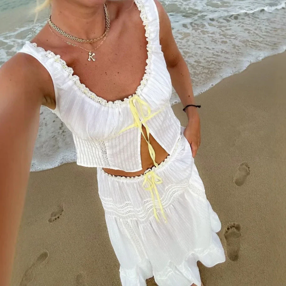 Ensemble Femme – Haut en Dentelle Débardeur – Jupe Taille Haute avec Volants et Cordon