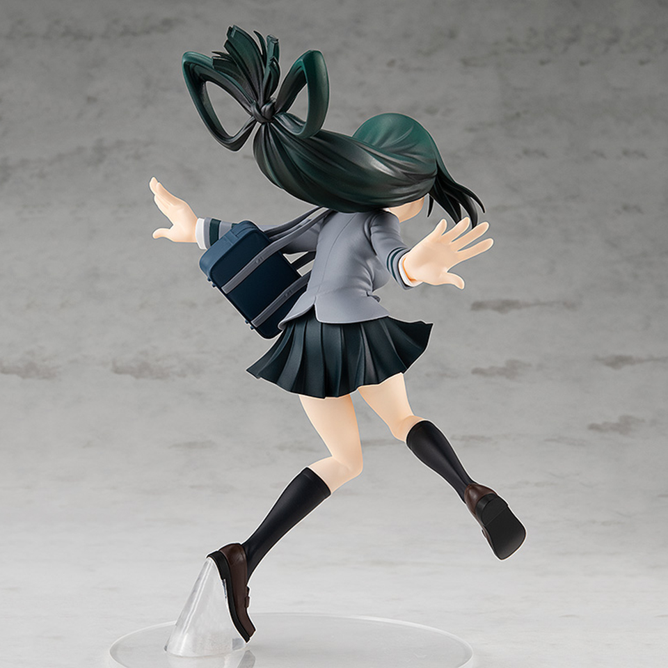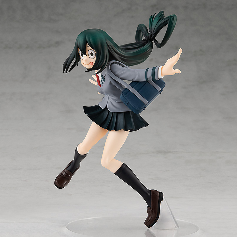 Figurine My Hero Academia Asuyu Tsuyu Figurine Manga mesure 15 cm de hauteur et est fabriquée en PVC. Elle représente le personnage dans sa tenue d’étude commune, avec une jupe noire et une veste grise d’académie. Le personnage est heureux et sa langue est tirée hors de sa bouche.