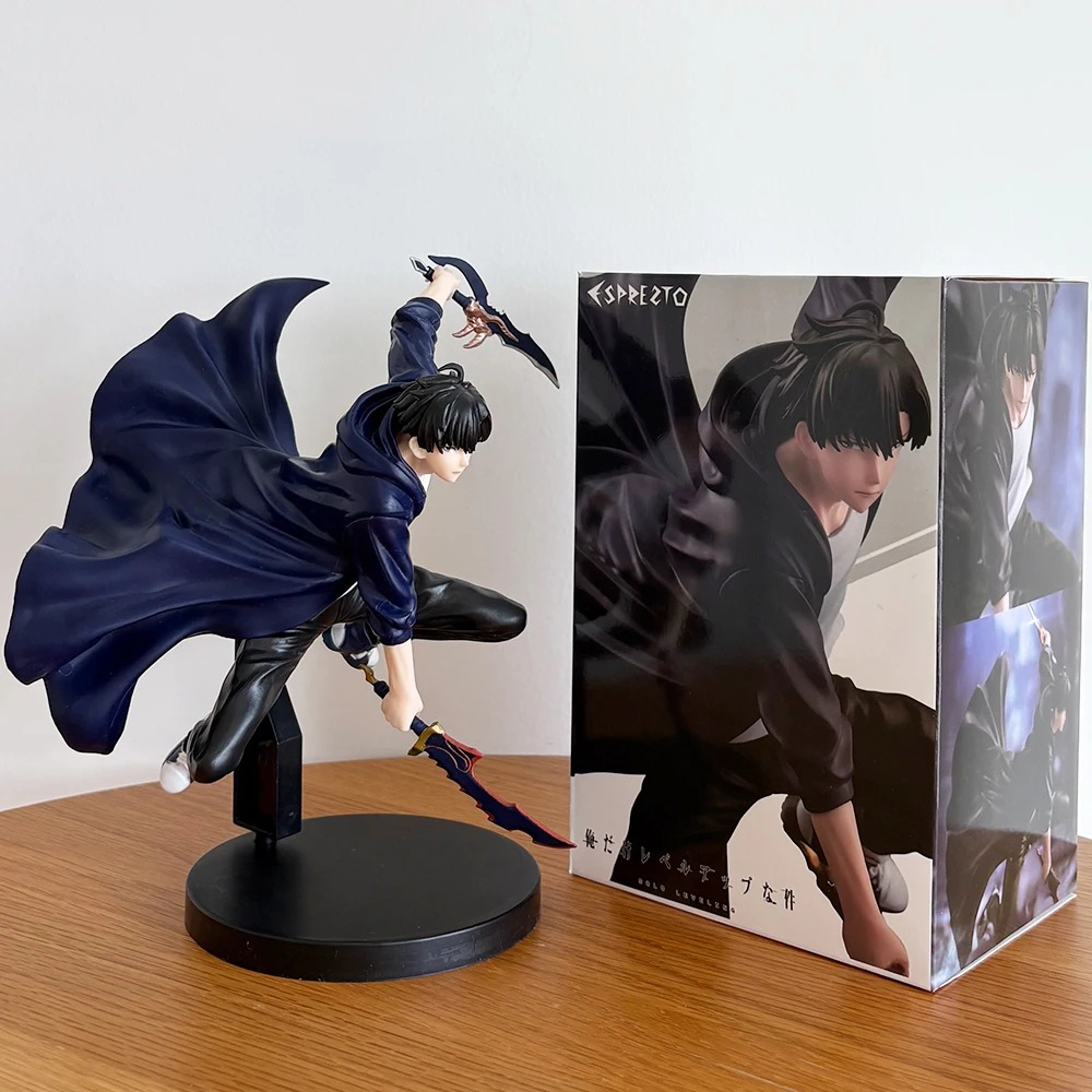 Figurine Sung Jin-Woo 18 cm en PVC peint. Pose de combat dynamique avec double lame, inspirée de Solo Leveling. Parfaite pour exposer.