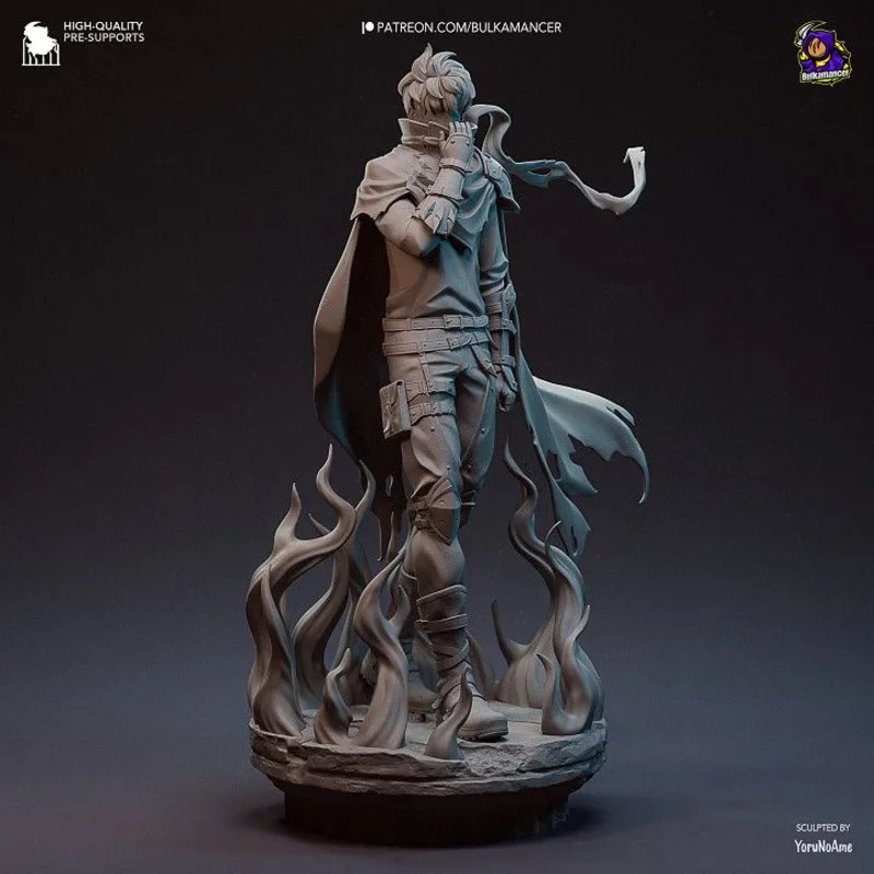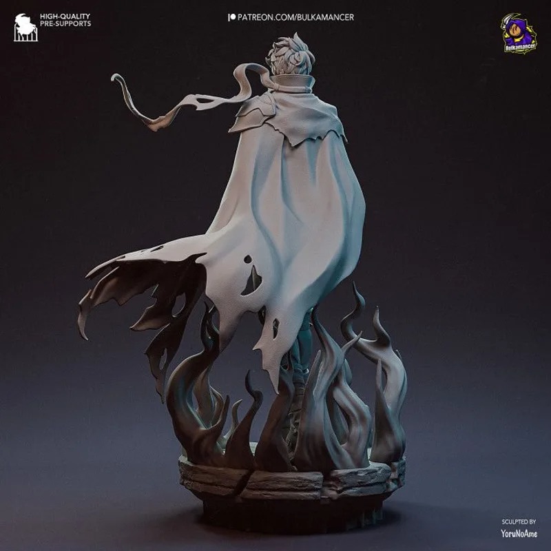 Figurine Sung Jinwoo 15 cm en résine brute. Version non peinte avec manteau flottant et flammes d’ombre, idéale pour modélisme et collection.