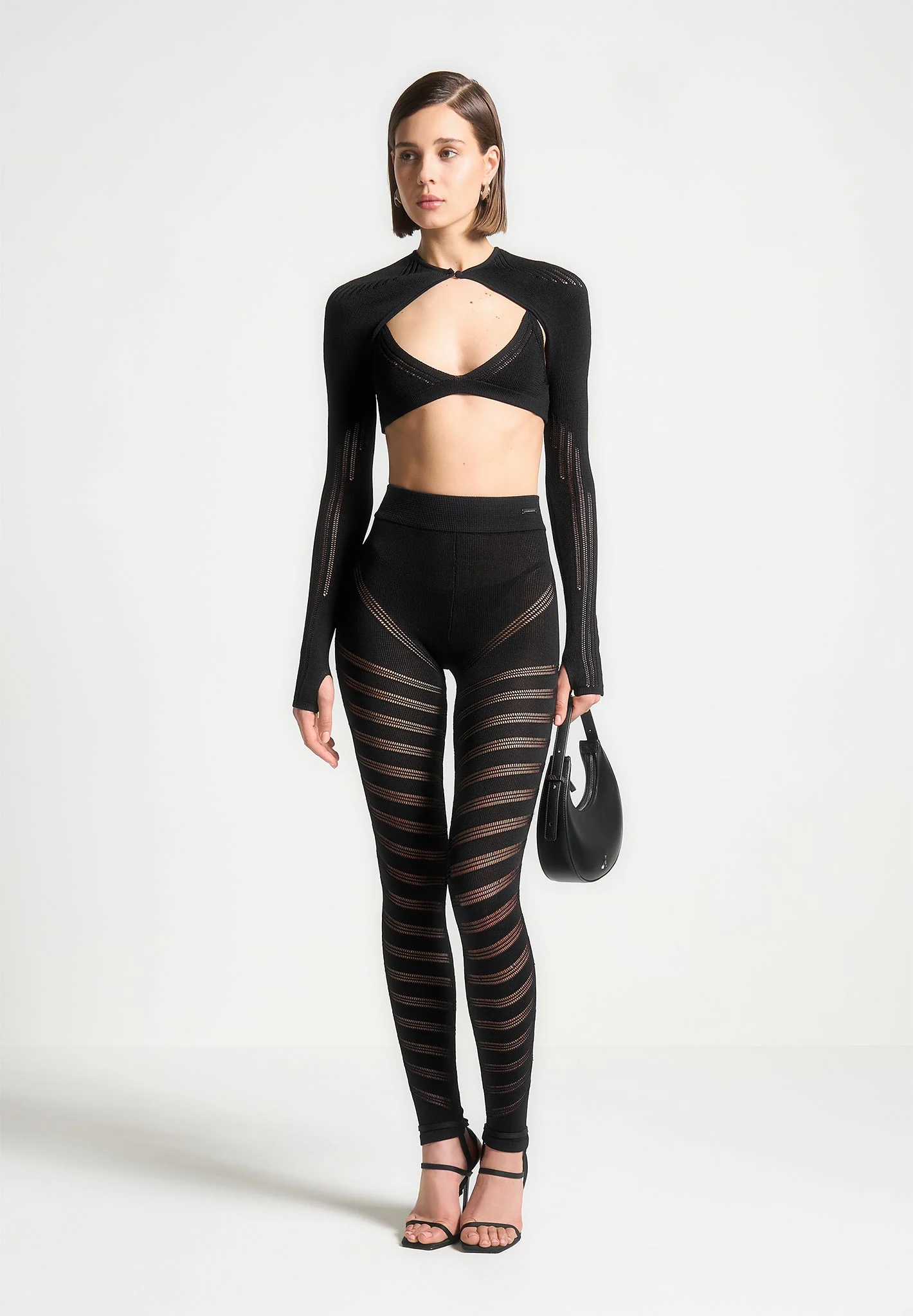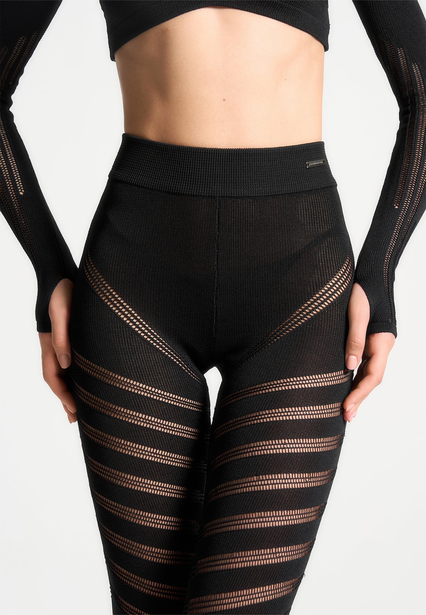 In our classic stretch yarn fabric combined with the carefully placed wide knit contrasting makes this set perfect for evenings out by seductively contouring the body. Leggings Silhouette Stretch Yarn Fabric High Waisted Deep Waistband Spiral Detailing Stirrups at Hem Silver Manière De Voir Plaque