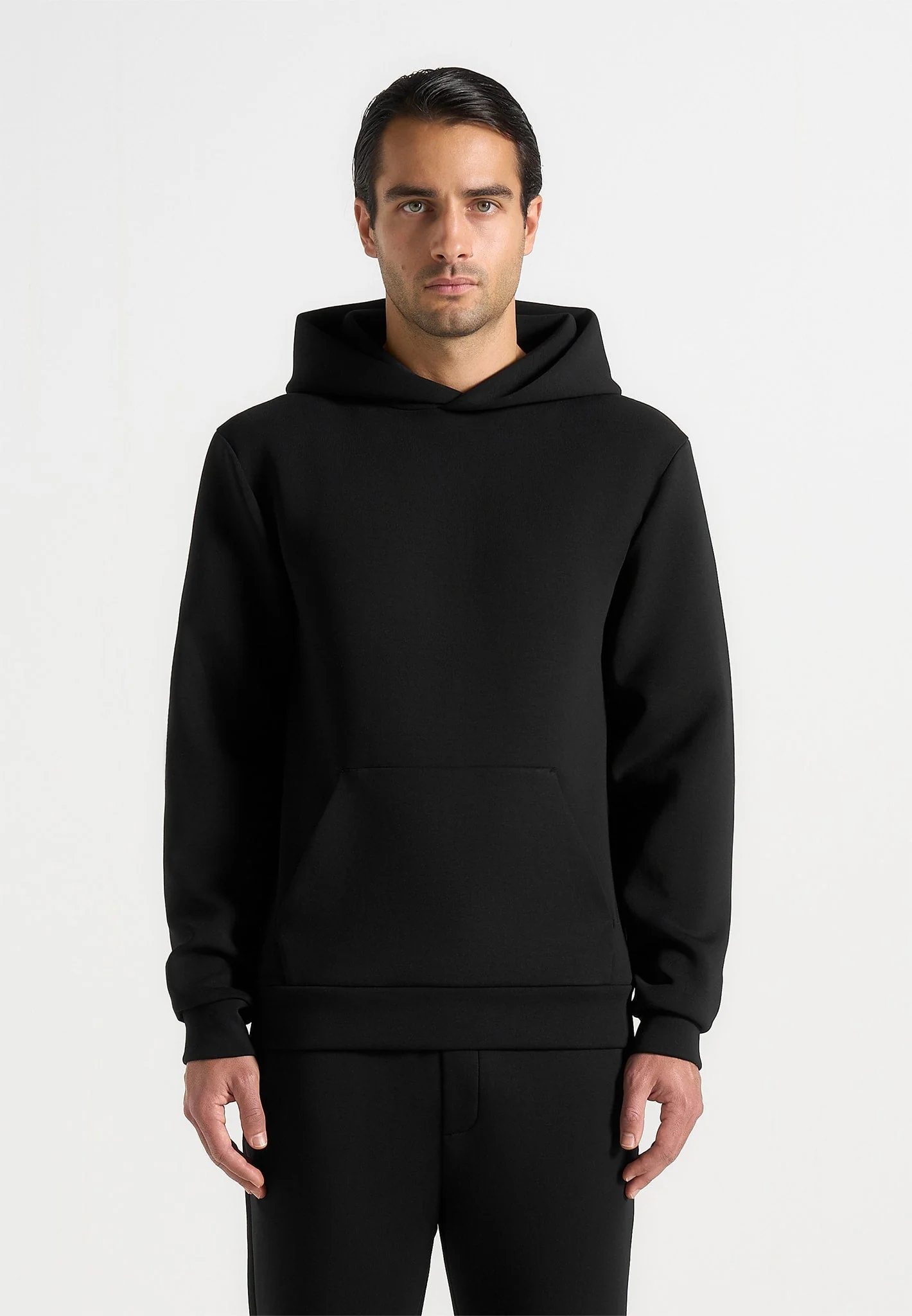 Designed to bring a modern feel to casual dressing, this hoodie is crafted from smooth neoprene fabric for a structured yet comfortable feel. The relaxed fit creates an effortless balance between polish and ease, while the clean silhouette keeps the look refined. Completed with functional kangaroo pocket, it merges contemporary design with everyday practicality.