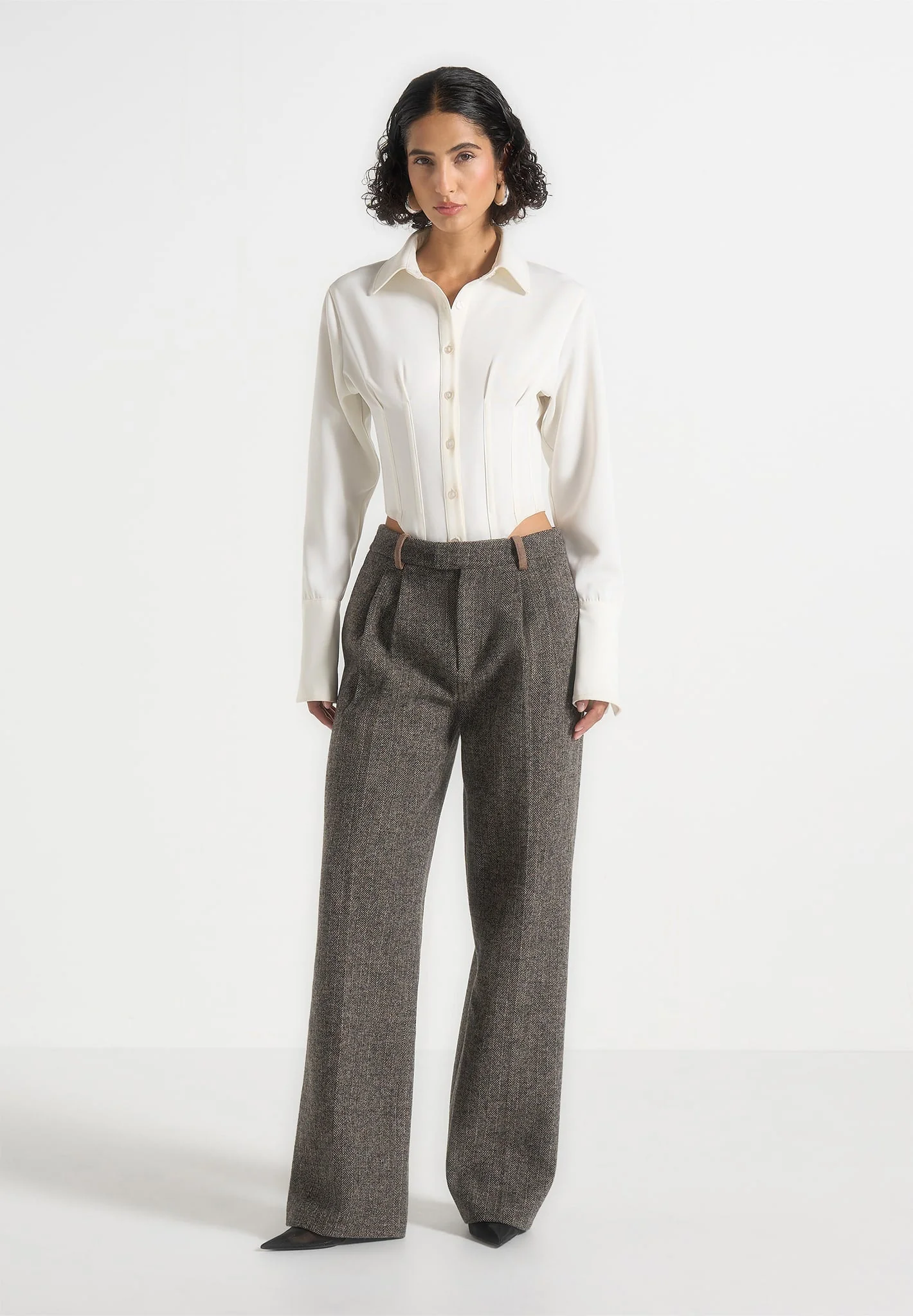 Julie – Herringbone Wool Twin Pleat Trousers – Grey