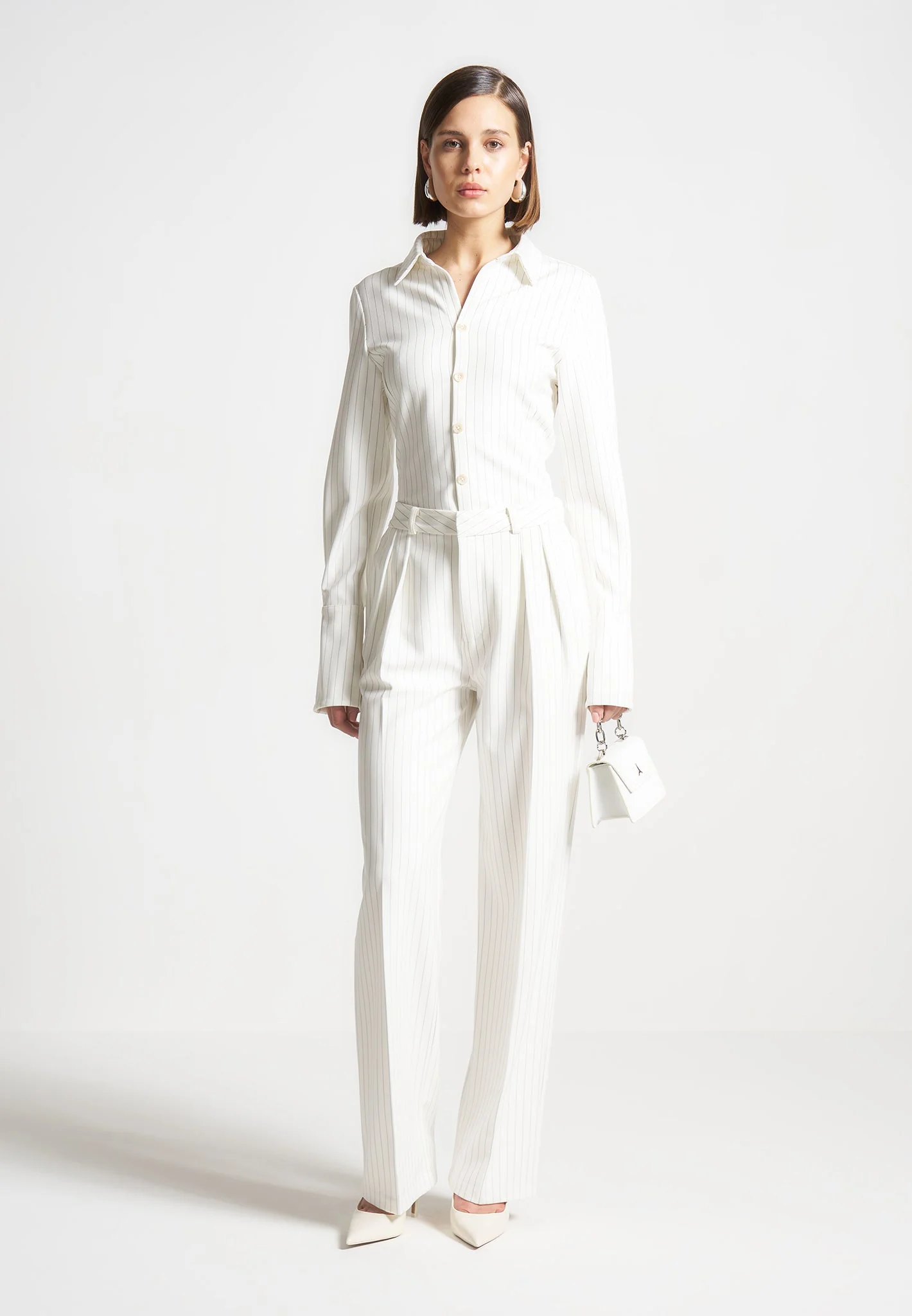 Julie – Pinstripe Twin Pleat Tailored Trousers – White