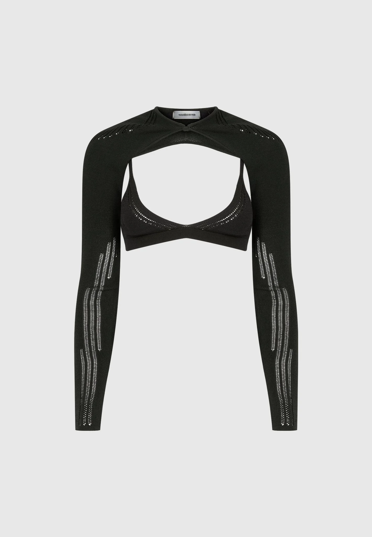 In our classic stretch yarn fabric combined with the carefully placed wide knit contrasting makes this set perfect for evenings out by seductively contouring the body. Bralette with Overlay Silhouette Stretch Yarn Fabric Crew Neckline Thumbholes in Sleeves Detached Overlay Silver Adjusters on Bralette Silver Manière De Voir Plaque