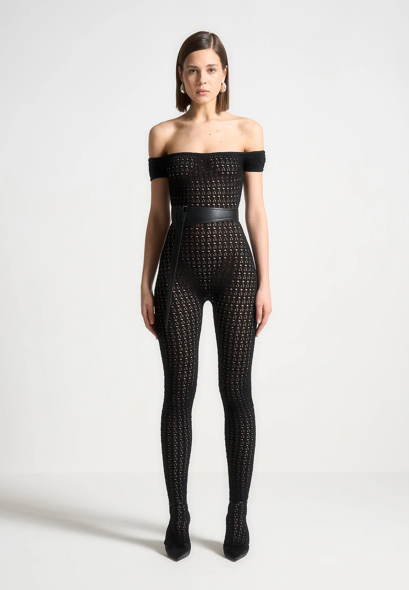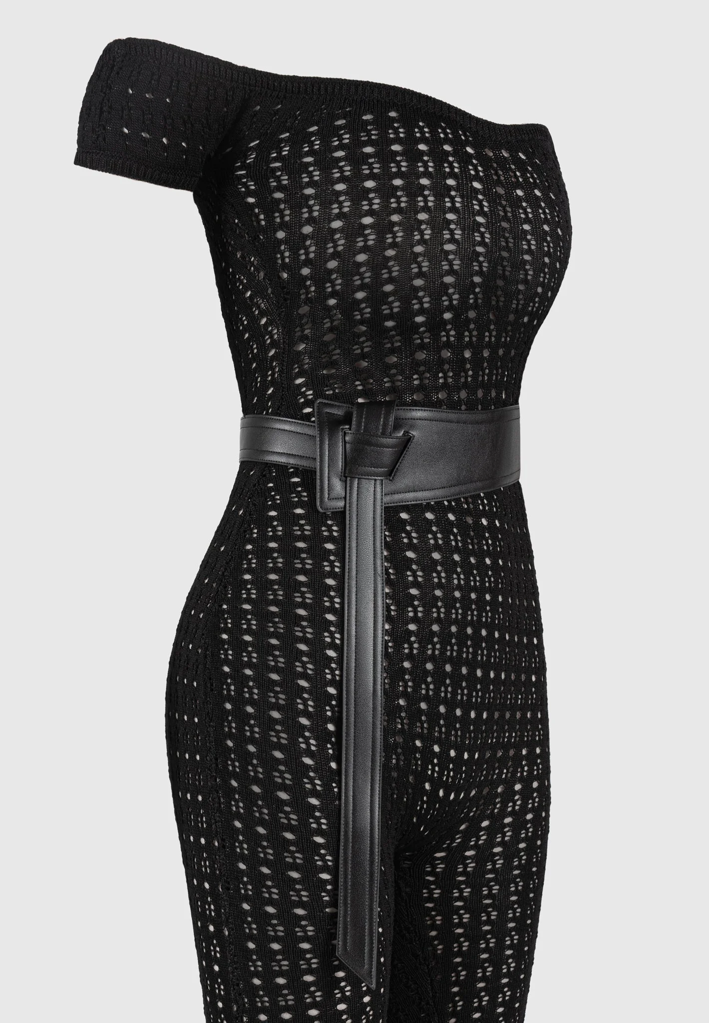 Crafted from high quality pointelle knit, this bardot jumpsuit offers a figure-flattering silhouette with its stretch fabric. Perfect for any occasion, the attached belt adds a touch of elegance to this unique and fashion forward piece.