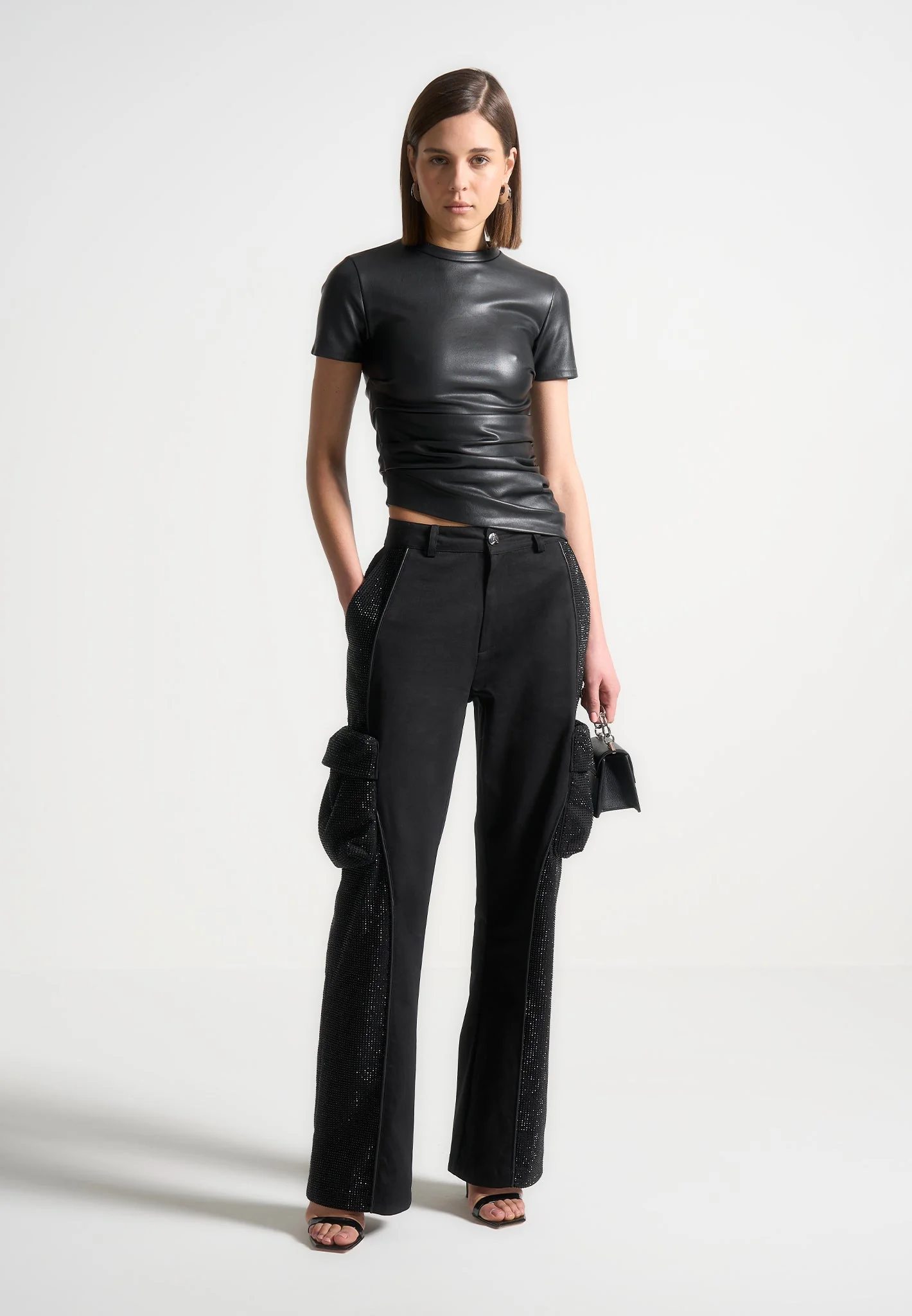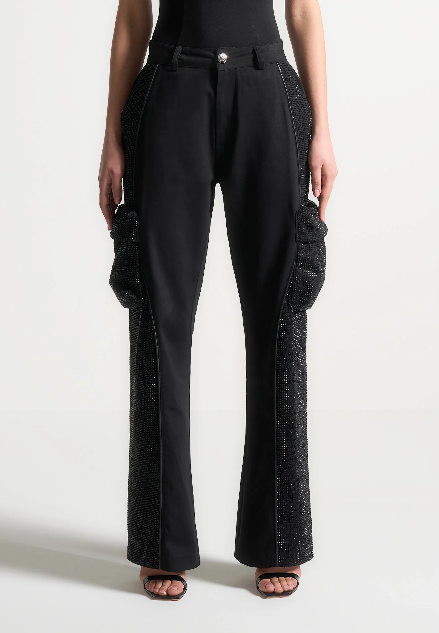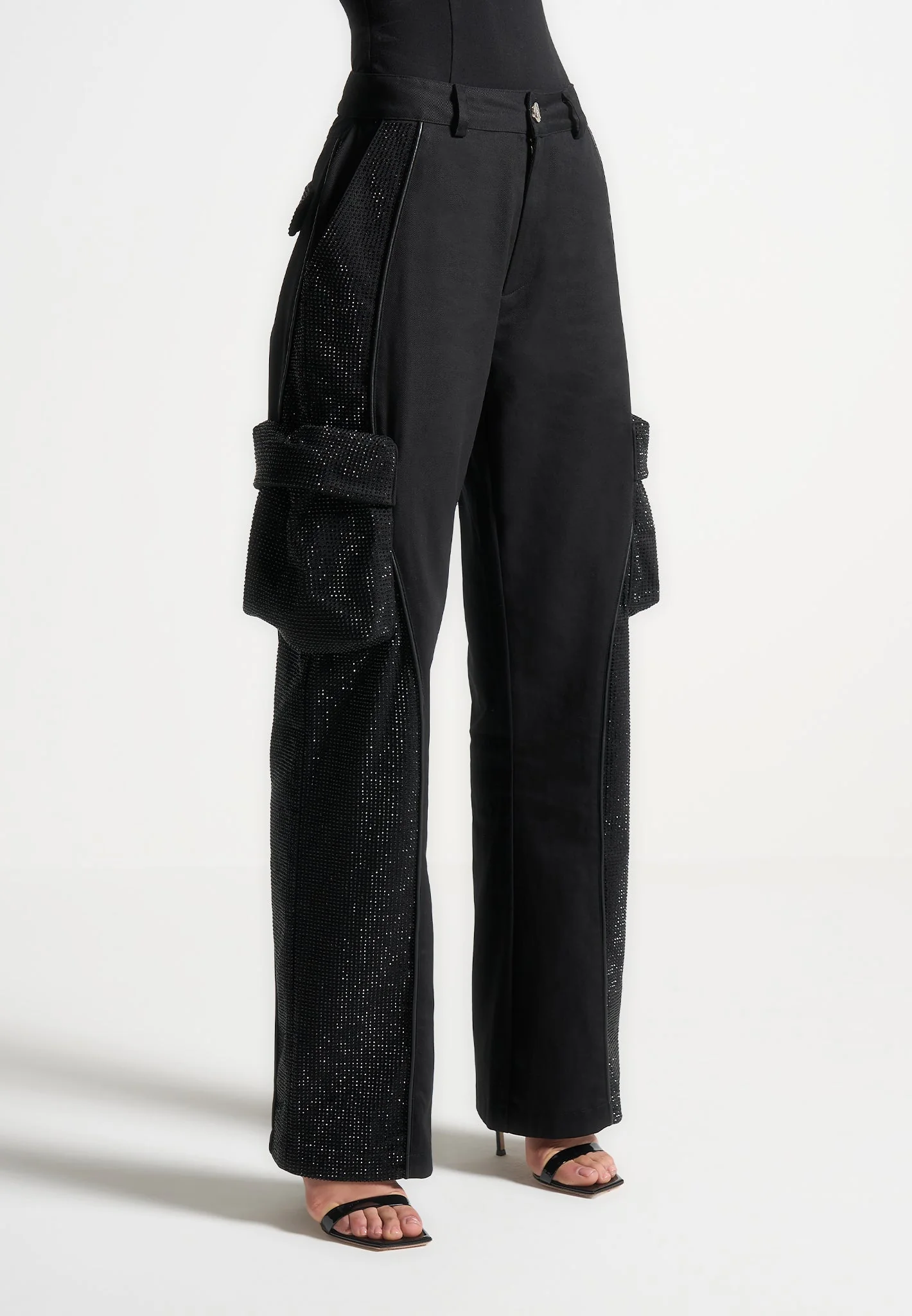 Not conforming to traditional cargo pants style, these pants will certainly have eyes heads turning to you with the full length rhinestone detailing.