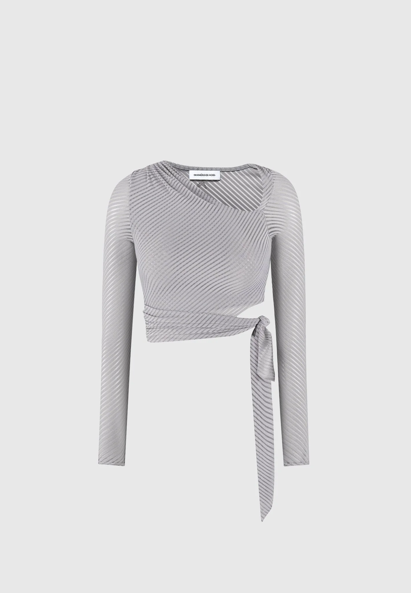 Expertly crafted with a lightweight double layer, this Ribbed Sheer Top with Tie boasts a unique asymmetric neckline for a modern touch. Perfect for any occasion, this top offers both style and comfort.