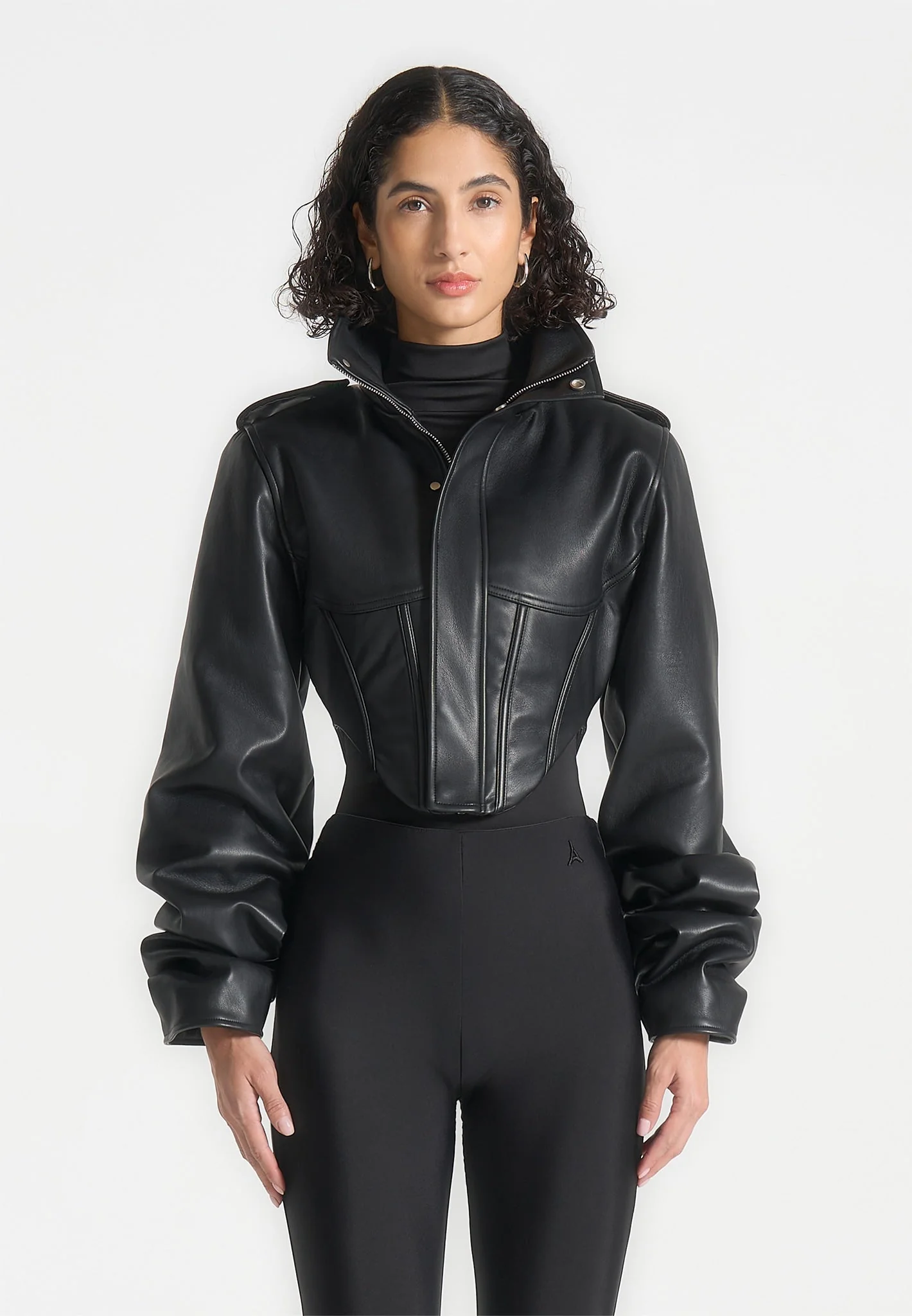 Crafted from luxurious vegan leather, this black jacket features intricate corset detailing and a high neck with tacked sleeves. Timeless in design, this jacket adds an elegant touch to any outfit. Made to last, it is a must-have for any fashion-forward wardrobe.
