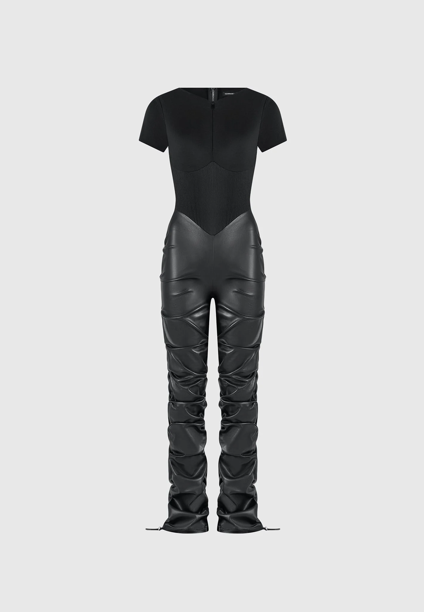 Our Tacked Vegan Leather T-Shirt Jumpsuit features a flattering fit and cinched waist creating a stunning ensemble that effortlessly combines fashion-forward design. Crafted from high-quality vegan leather, this jumpsuit maintains a luxurious and edgy appeal.
