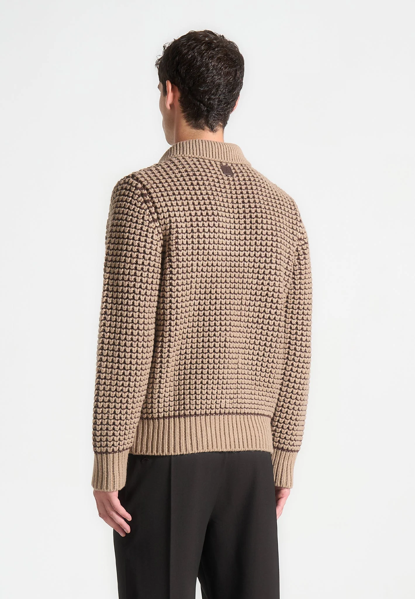 The Textured Wool Knit Polo Jumper in Taupe offers a clean, modern take on a classic staple. Made from soft wool blend fabric, it features a button-up collar and a cable knit texture, blending practicality with style. Its timeless design and comfortable fit make it a go-to piece for effortless, everyday wear this season.