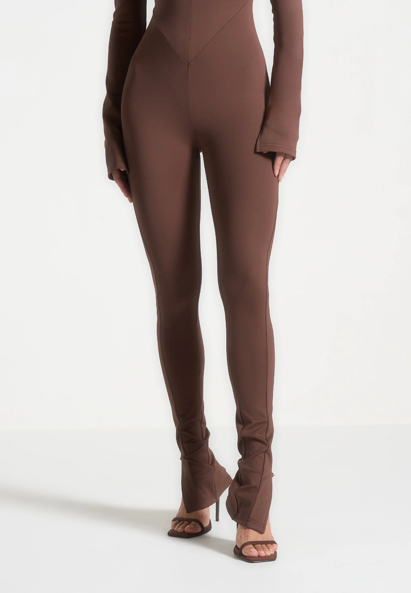 The long sleeve design and seam contour detailing provide a sleek silhouette, while the twist neckline adds a touch of elegance. This jumpsuit is designed to accentuate your figure.