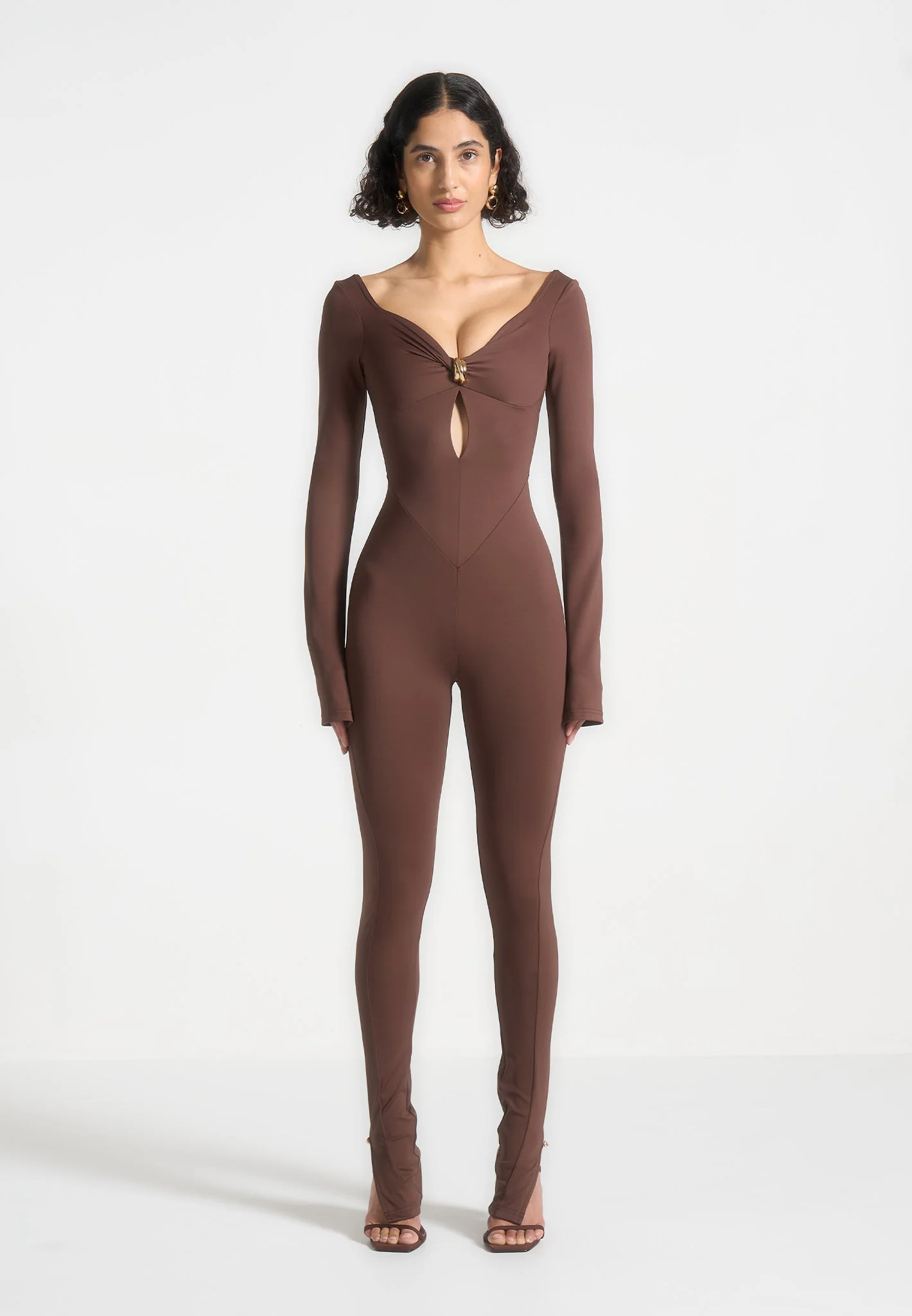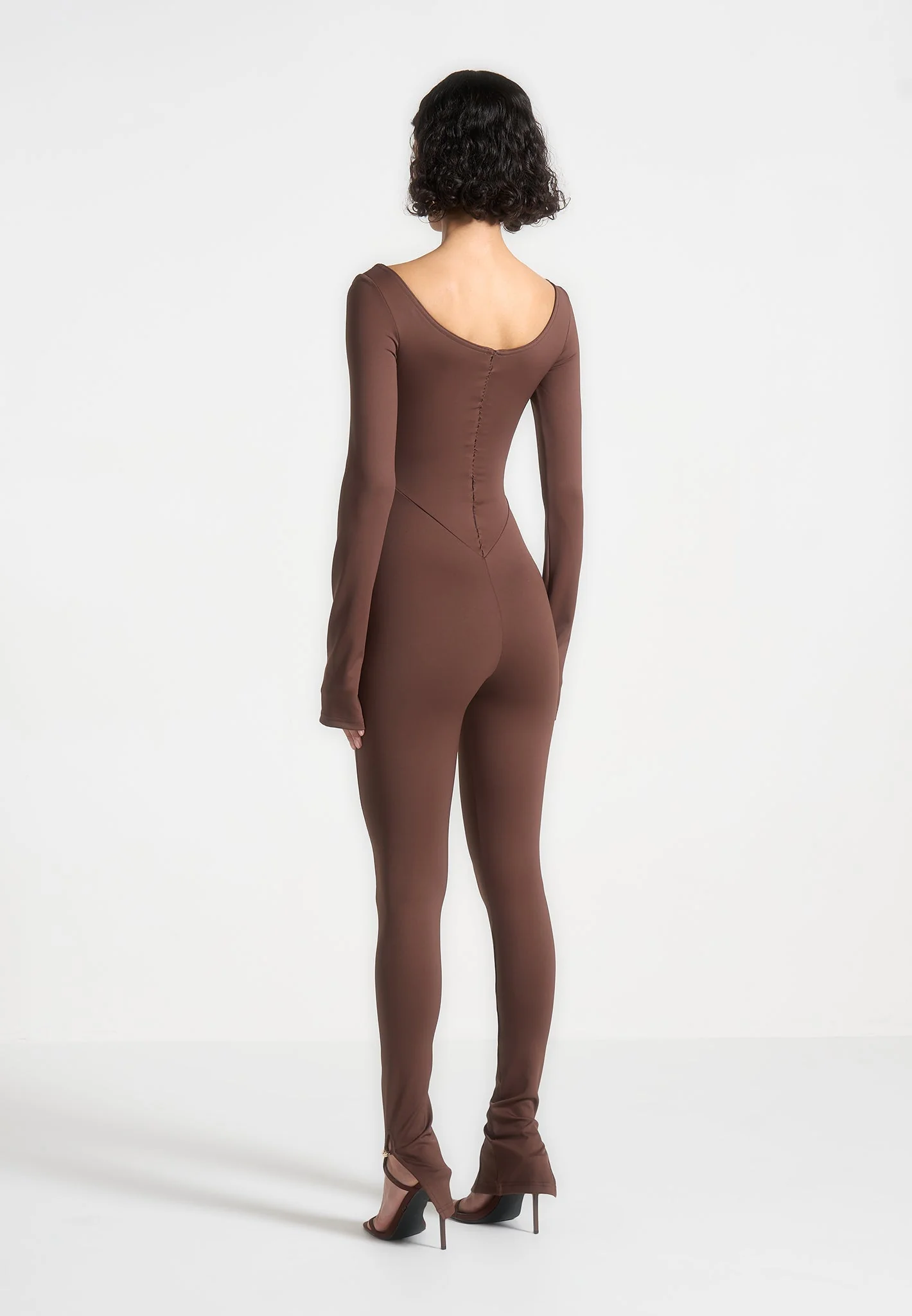 The long sleeve design and seam contour detailing provide a sleek silhouette, while the twist neckline adds a touch of elegance. This jumpsuit is designed to accentuate your figure. Jumpsuit Silhouette Waist Contouring Flattering Fit Invisible Zip at Back Complimentary Hardware on Bust and Leg Opening Tonal Manière De Voir Eiffel Zip
