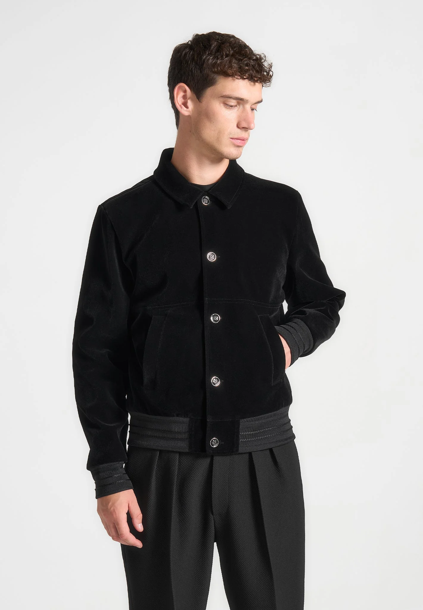 Elevate your wardrobe with the Velvet Trucker Jacket in Black. Featuring a soft velvet finish, ribbed cuffs, and a button-up front, it blends a modern trucker silhouette with casual comfort. Complete with angled side pockets, this versatile piece is perfect for any occasion this season.