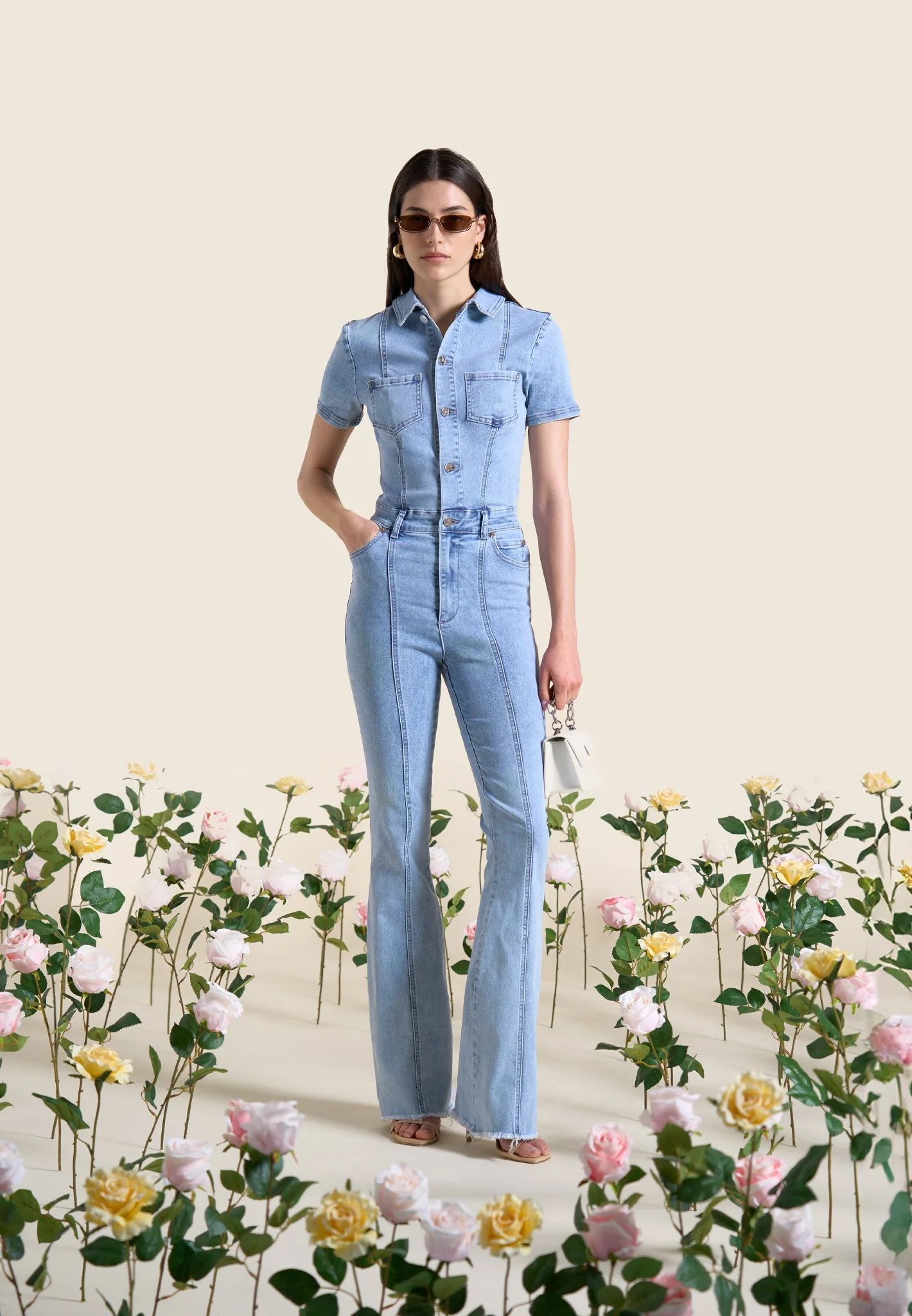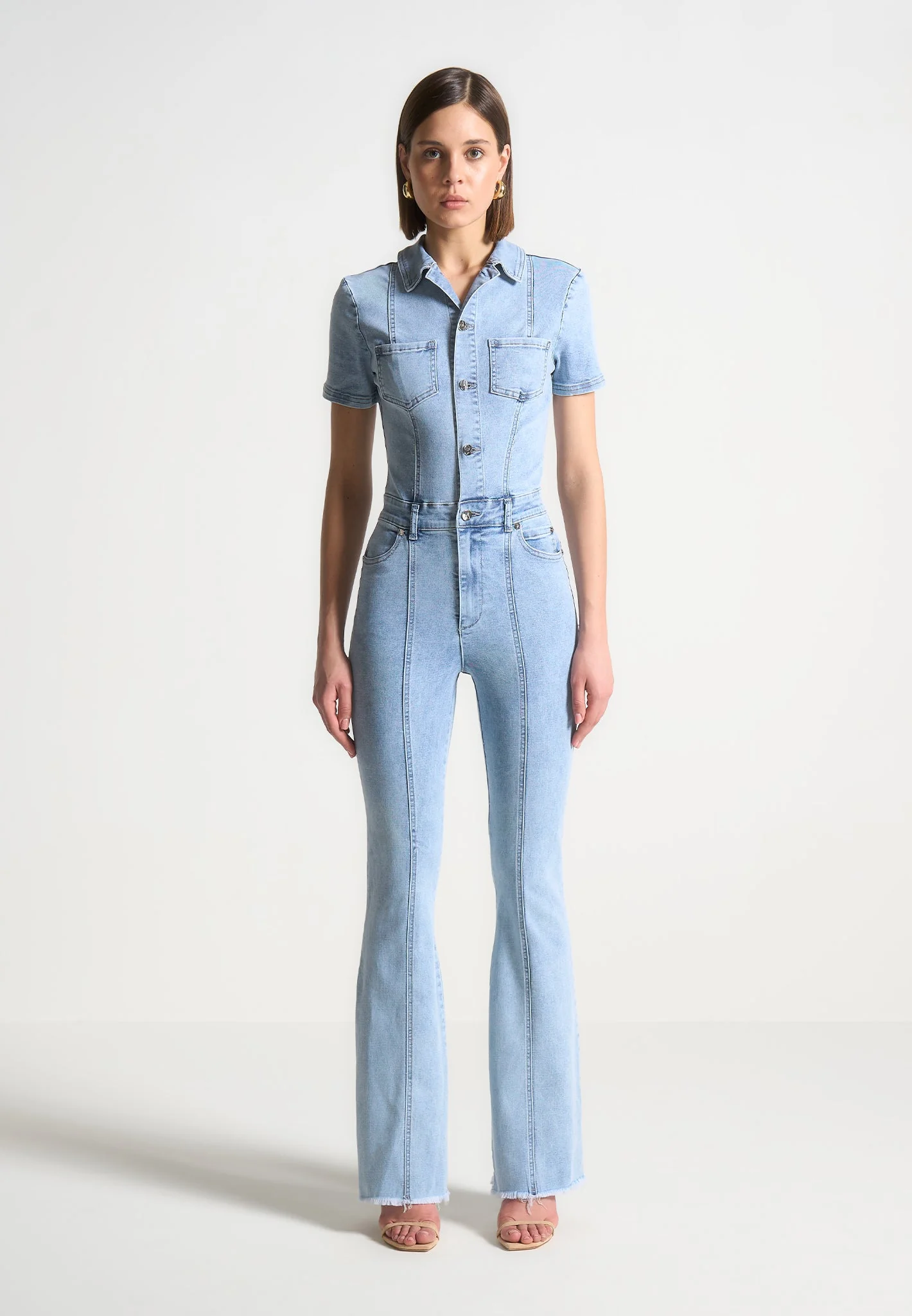 Expertly crafted and designed for ultimate comfort and style, our Mini Flared Denim Jumpsuit in Mid Blue is a must-have addition to your wardrobe. Made with stretch fabric for a figure flattering fit, and featuring a flared silhouette, it’s the perfect piece for any occasion. Upgrade your look with this jumpsuit.
